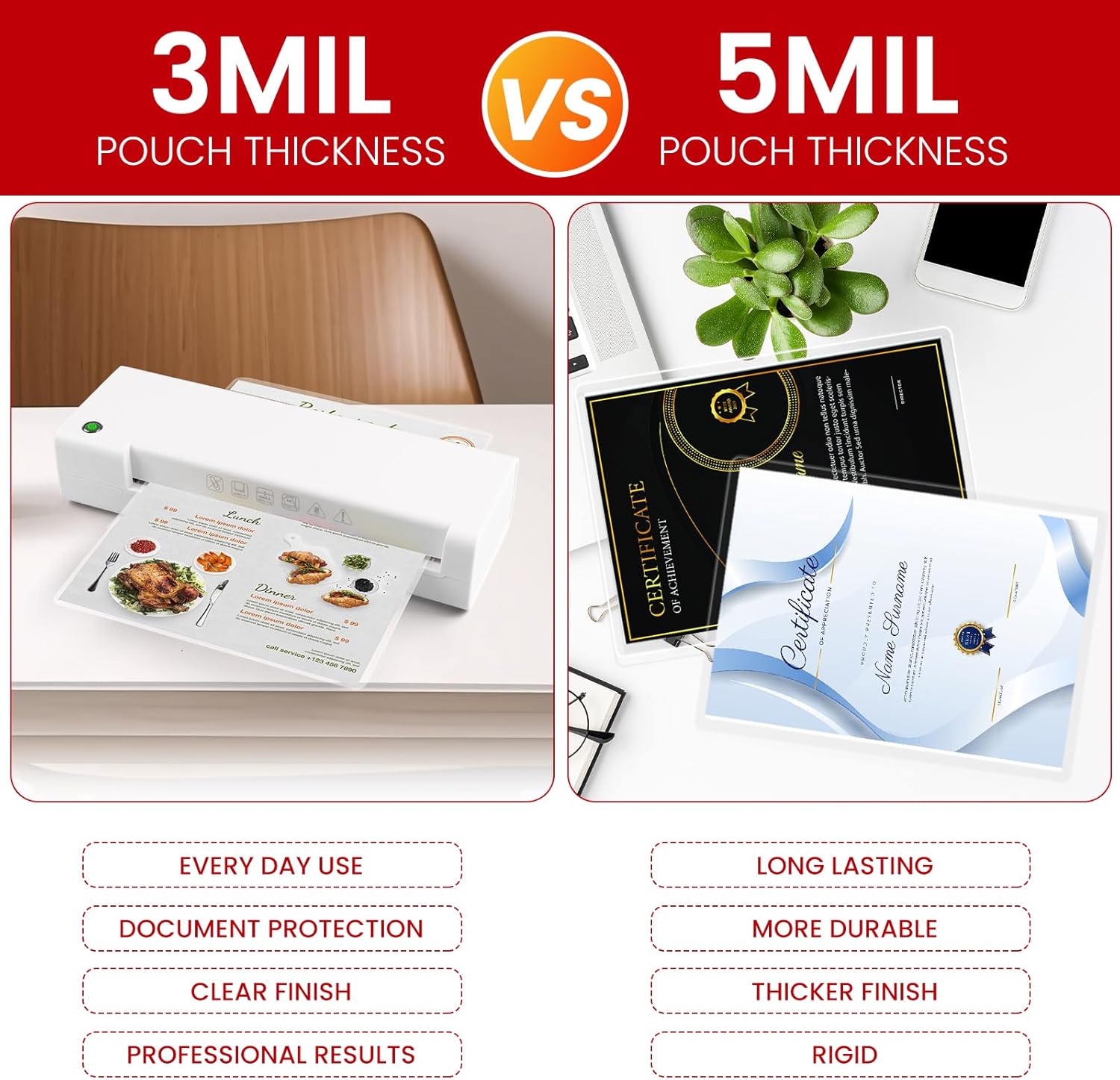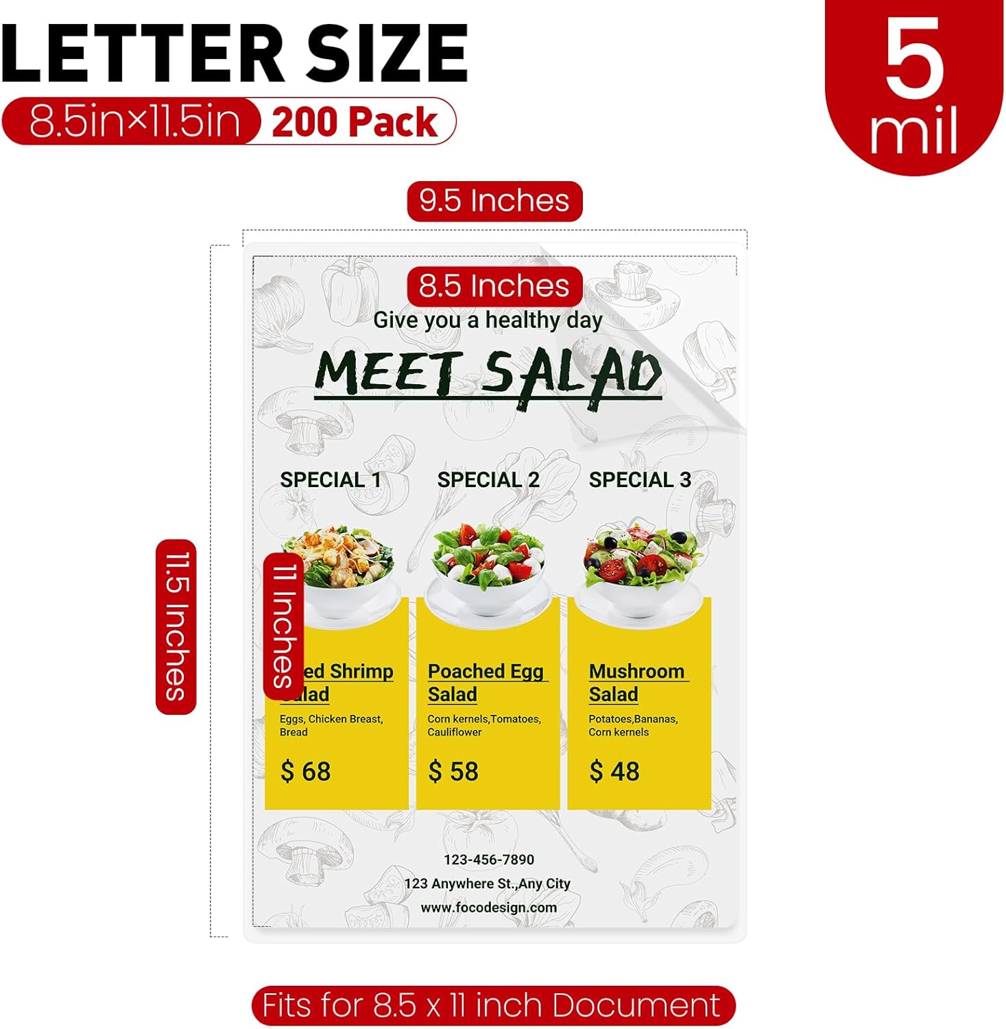 • Laminating Pouches Dimensions: 200PACK , 9" x 11.5", thickness: 5 Mil, fits for 8.5 x 11 inch document