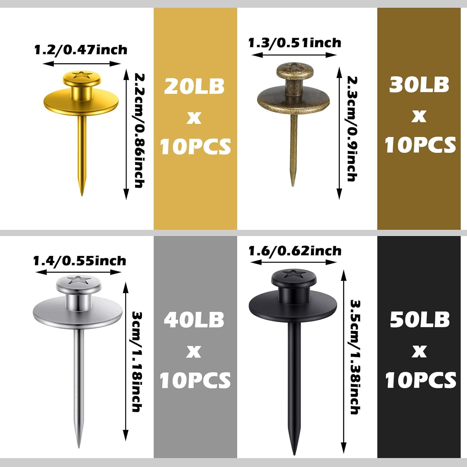 • Diverse Weight Bearing to Choose: you will receive 40 picture frame nails, 4 different load-bearing and colors, namely 10 gold 20 lb, 10 bronze 30 lb, 10 silver 40 lb, 10 black 50 lb, which allow you to choose different bearing nails according to the needs of hanging pictures, bringing you a pretty convenience; Sufficient quantity and different bearing can meet your various needs