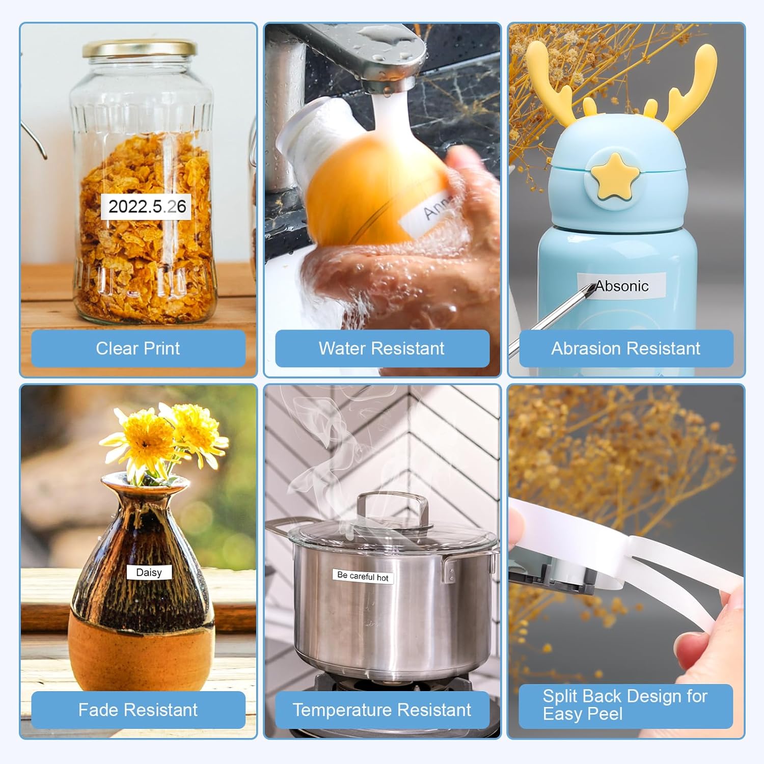 • Features: 12mm black on white label tape compatible with Brother P Touch label tape tz tze 12mm 0.47 inch white tape is waterproof, abrasion resistant, fade resistant, and temperature resistant. The split-back design for easy peel