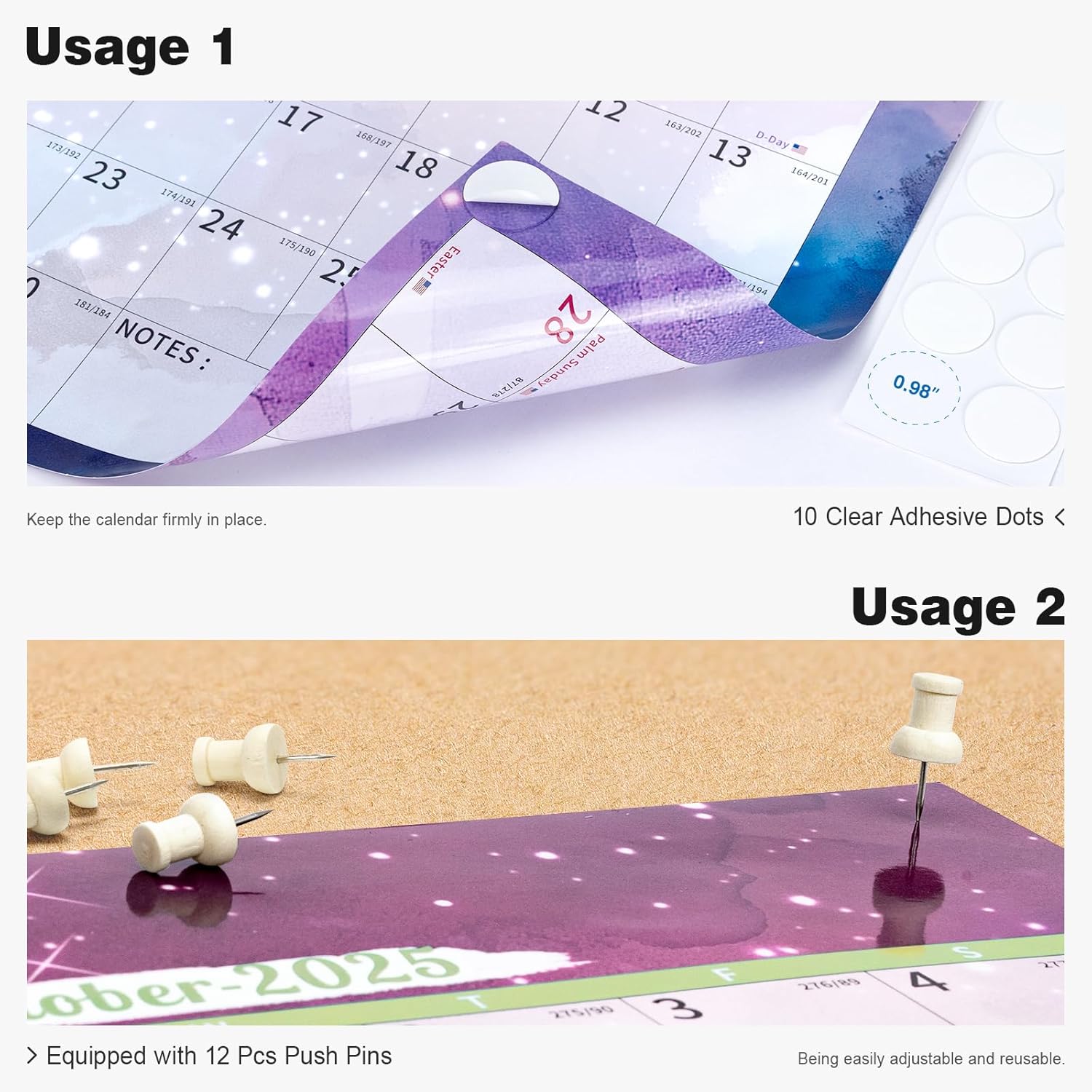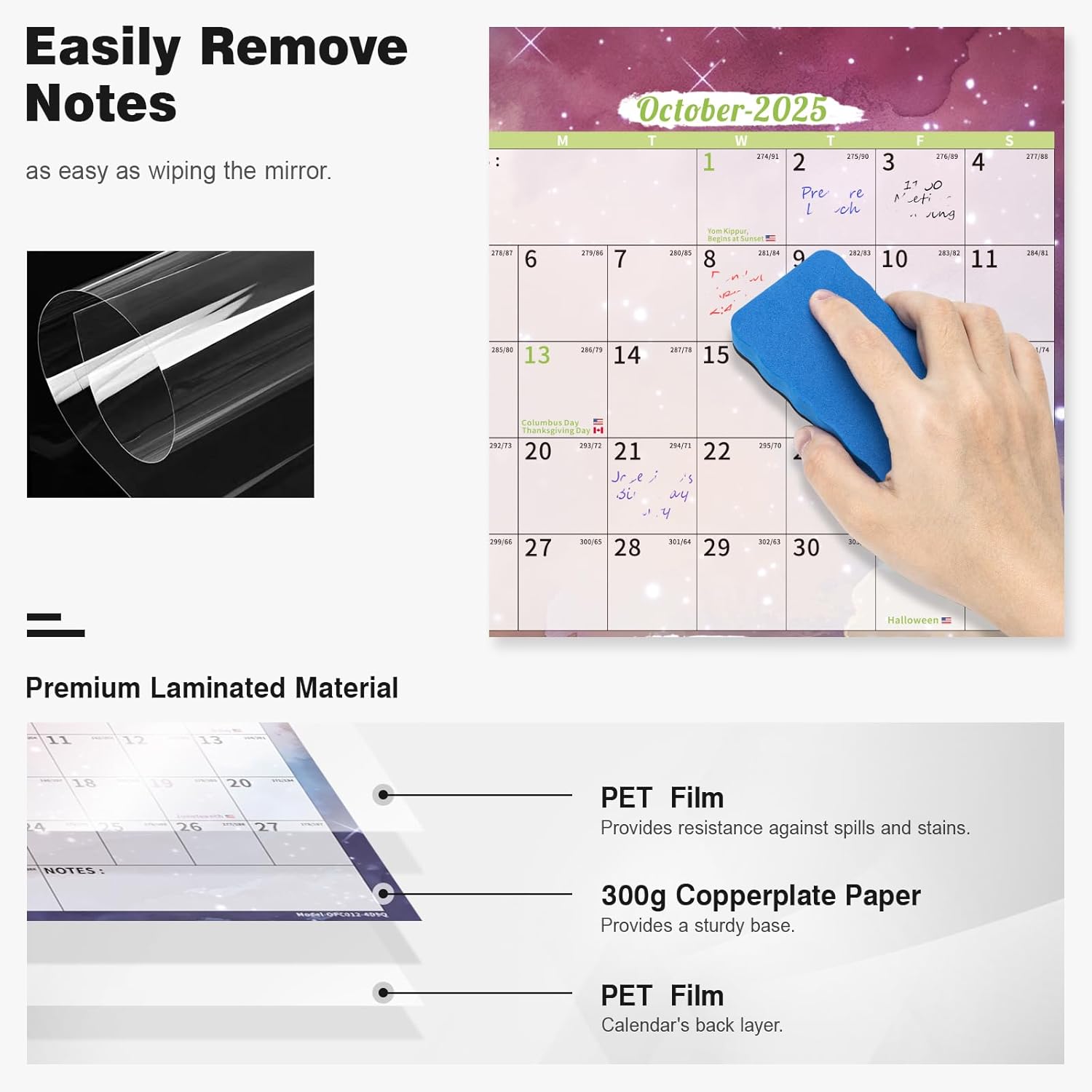 • ✨ Laminated Calendar with Dates: Waterproof wall calendar comes with a mini eraser, four dry-erase markers, 12 push pins, and 10 transparent round stickers. 12 months calendar covers the time range from July 2025 to June 2027, making it perfect for long-term use.