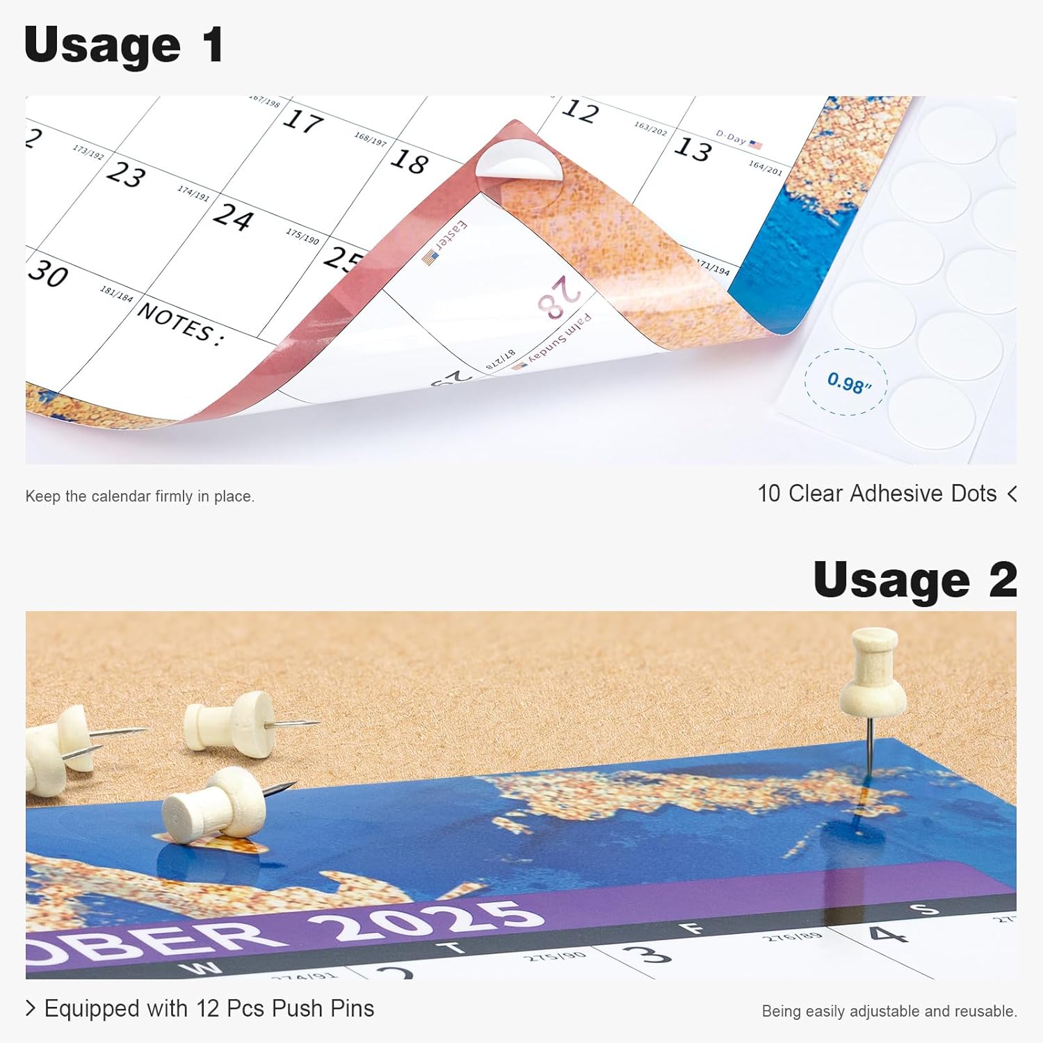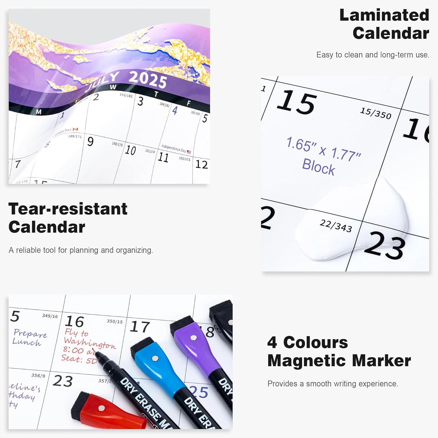 • ✨ Laminated Calendar with Dates: Waterproof wall calendar comes with a mini eraser, four dry-erase markers, 12 push pins, and 10 transparent round stickers. 12 months calendar covers the time range from July 2025 to June 2027, making it perfect for long-term use.