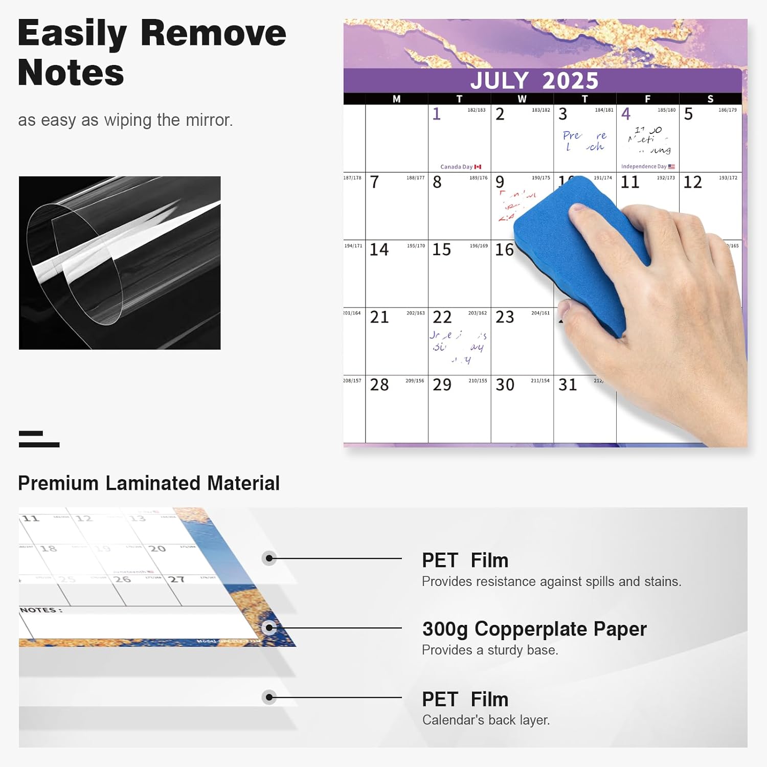 • ✨ Dry Erase Wall Calendar : is made of PET Film and 300 grams Copperplate Paper, providing a durable surface that resists scratches and smudges, while the sturdy Copperplate Paper backing keeps it in place without curling.