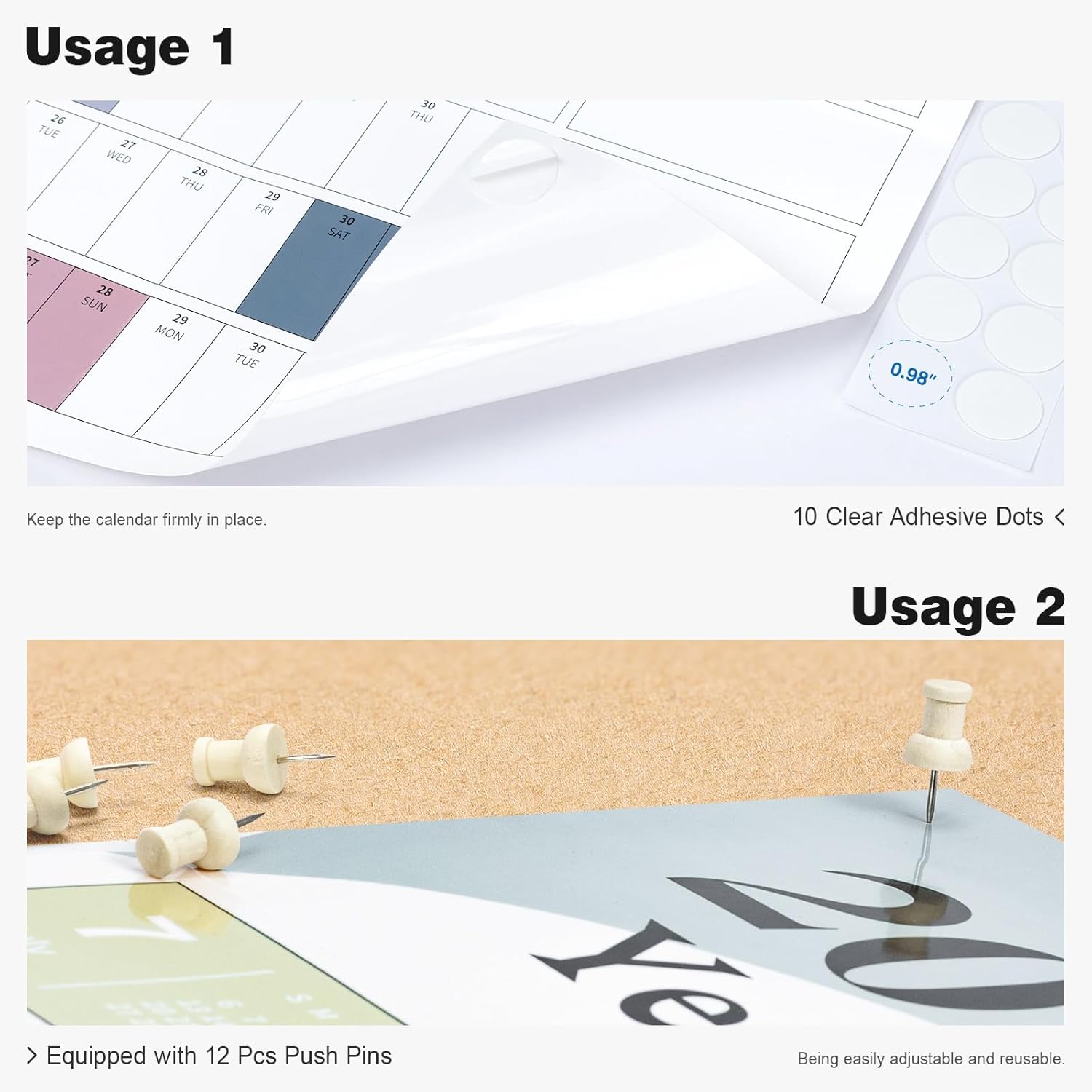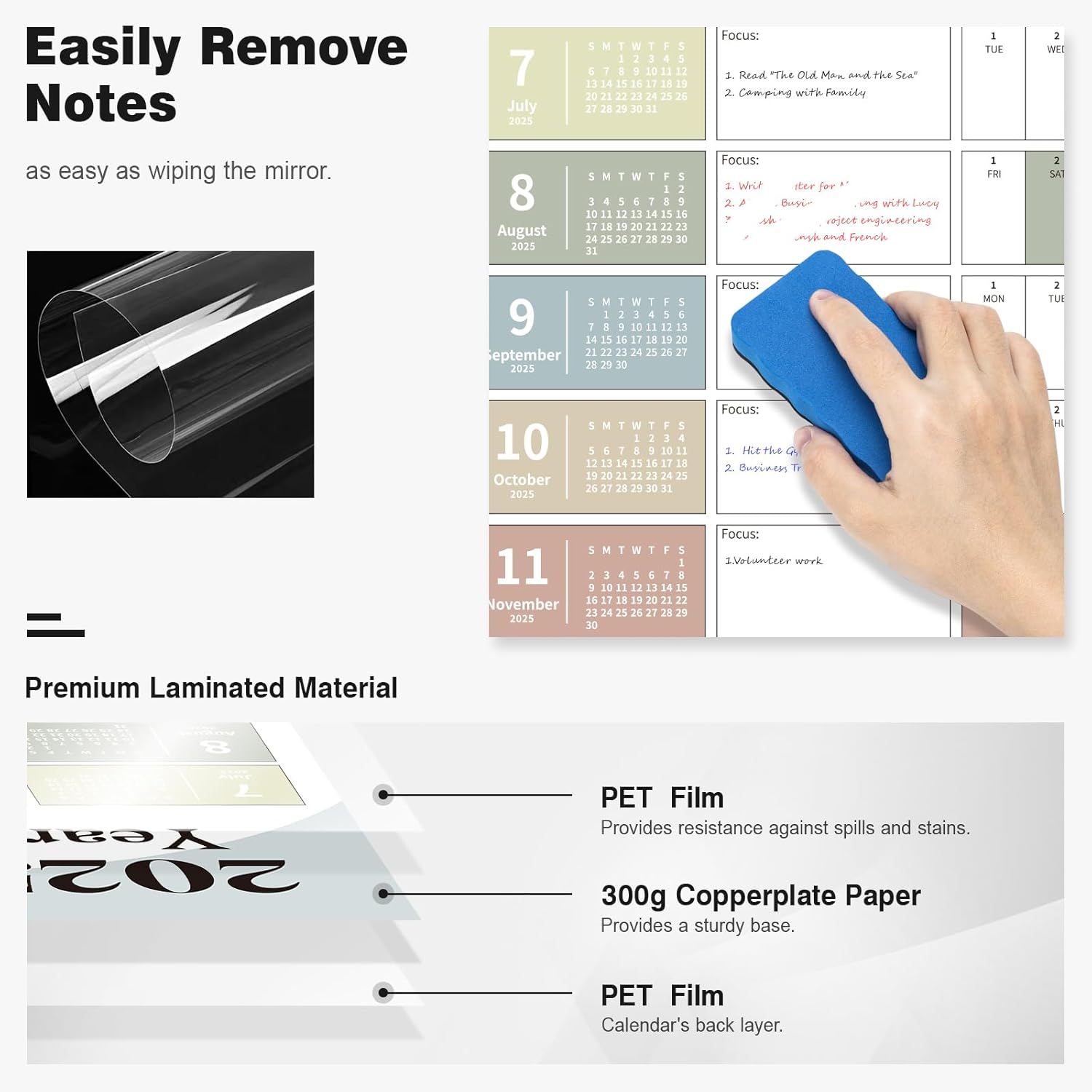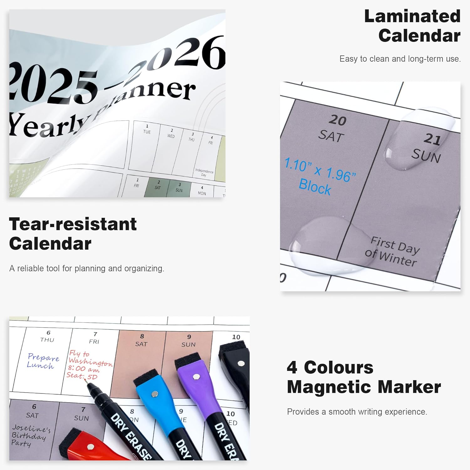 • ✨ Laminated Calendar with Dates: Waterproof wall calendar comes with a mini eraser, four dry-erase markers, 12 push pins, and 10 transparent round stickers. 12 months calendar covers the time range from July 2025 to June 2026, making it perfect for long-term use.