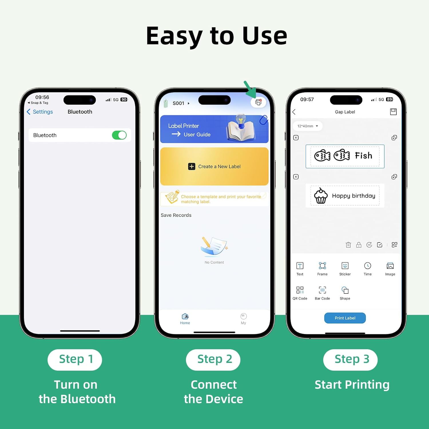 • Multiple Creative Functions: The Snap & Tag app for this Bluetooth label maker provides various features and templates, easily create label stickers with text, QR codes, barcodes, materials, images, time, and borders; Customize label lengths with continuous tape, or use fixed-size labels for batch printing, featuring a built-in cutter for simple label cutting