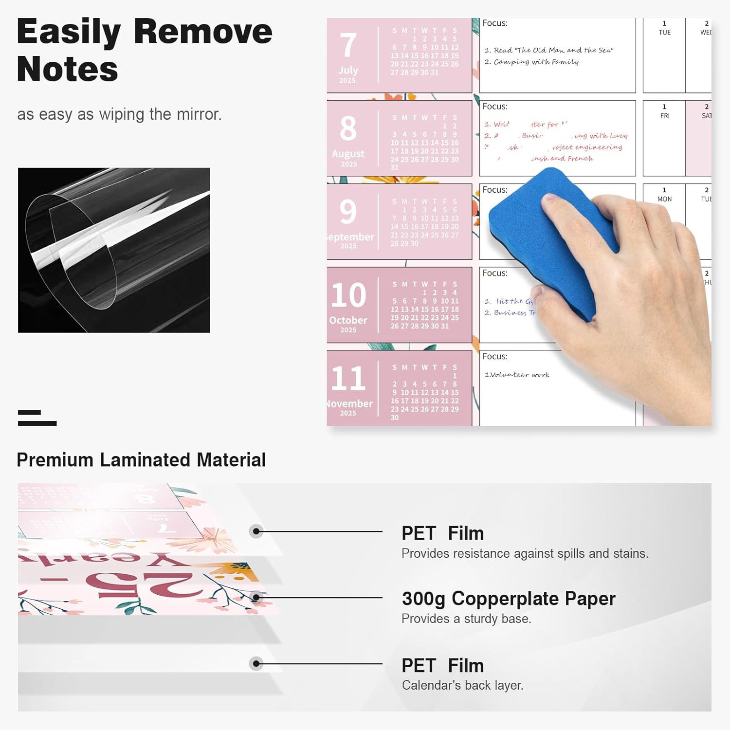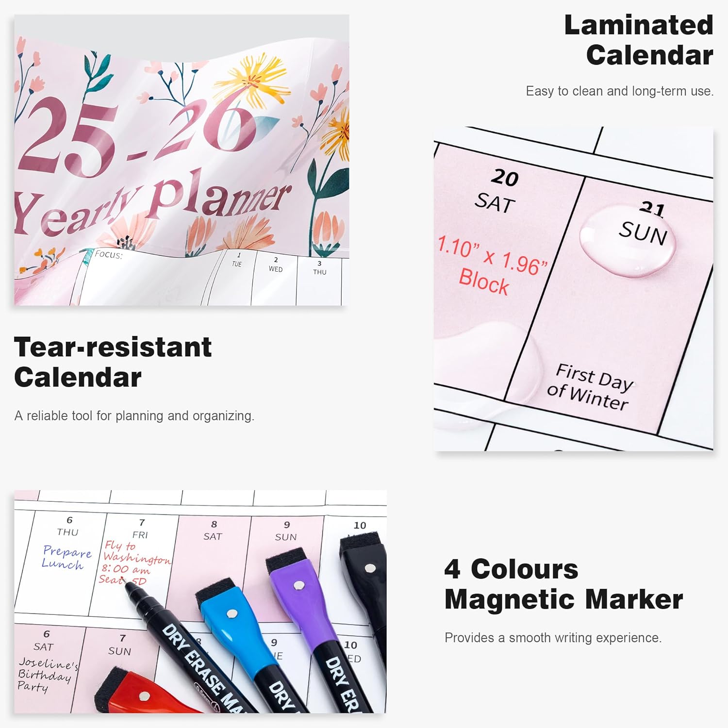 • ✨ Laminated Calendar with Dates: Waterproof wall calendar comes with a mini eraser, four dry-erase markers, 12 push pins, and 10 transparent round stickers. 12 months calendar covers the time range from July 2025 to June 2026, making it perfect for long-term use.