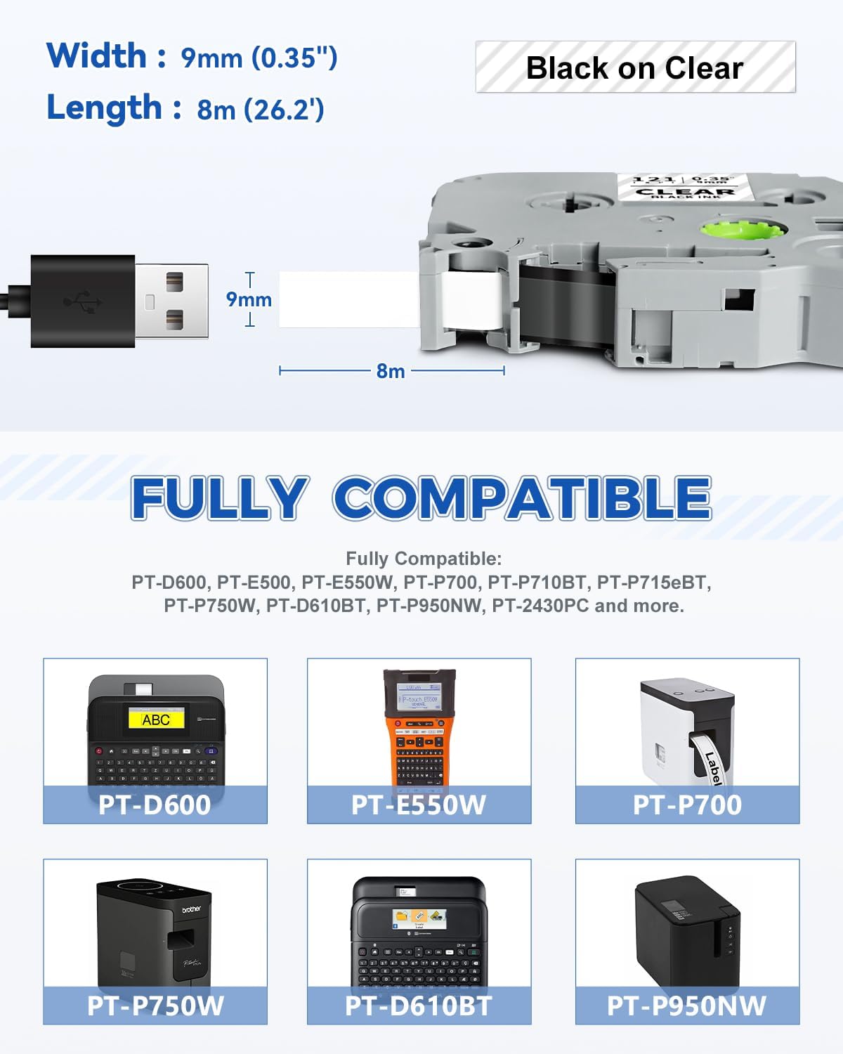 • Packages: 4-Pack 9mm 0.35" clear label tape compatible with Brother tze-121 tze121 tz-121 9mm 3/8" black on clear label maker tape. Color: Black on clear. Size: 3/8 inch (9mm 0.35") x 26.2 feet (8m)