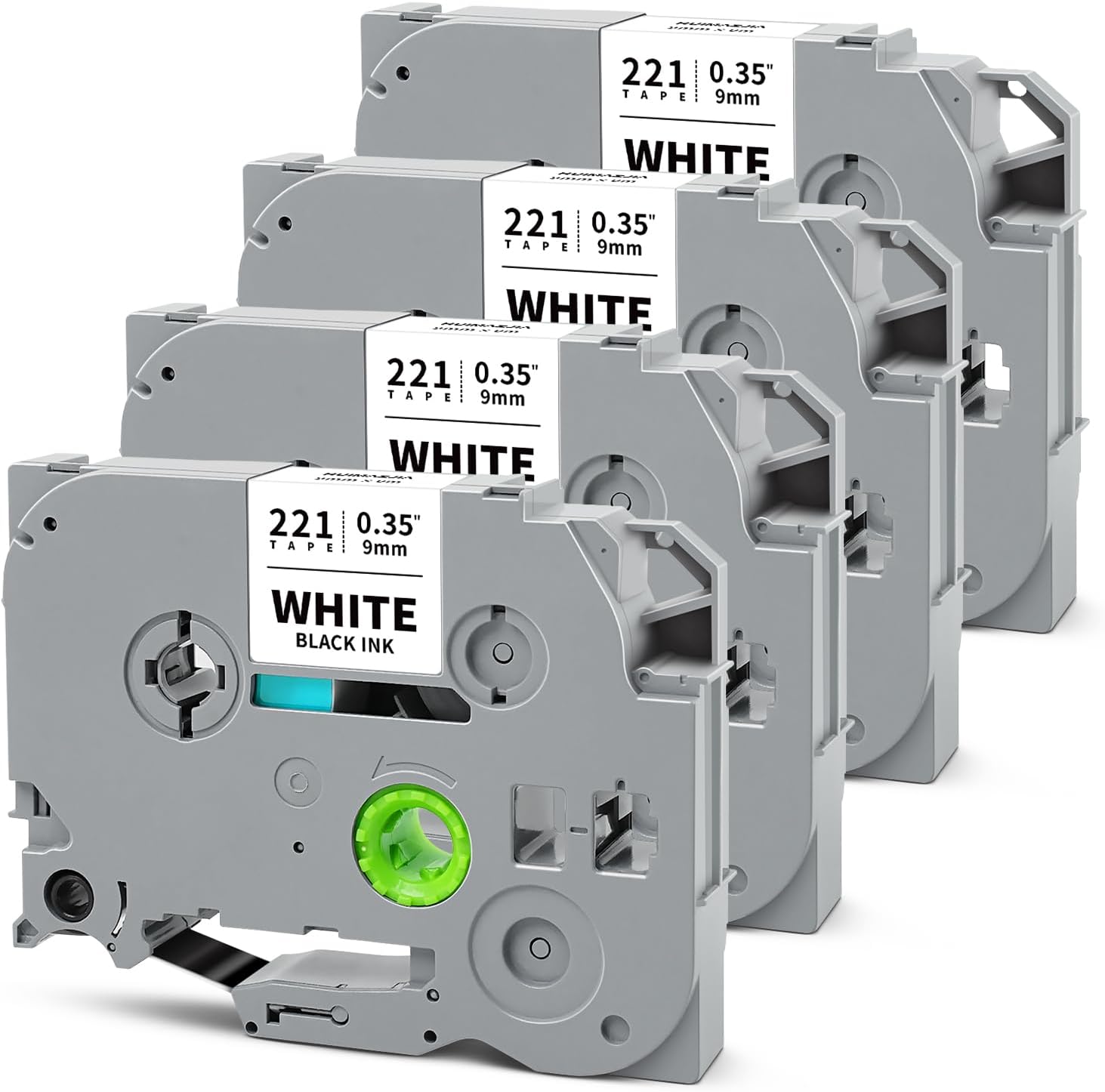 Tze221 9mm 0.35" Laminated White Tape Compatible for Brother 9mm Label Tape Tze-221 Tz-221 P Touch Tz Tze 9mm 3/8" Black on White Label for PTH110 PTD210 PT-D220 PTD400 PT-D610BT, 4-Pack