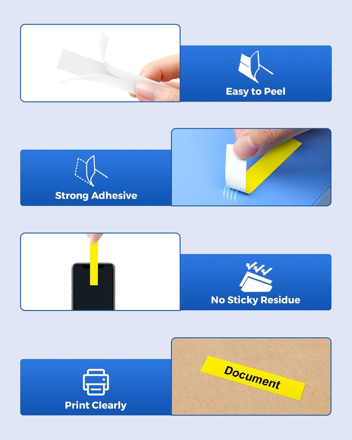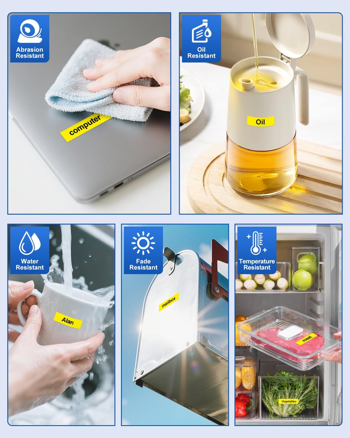 • Features: Our 12mm 0.47" yellow label maker tape split design makes the label tape easy to peel and apply, with strong adhesion/waterproof/temperature/oil/abrasion/fading, and reliably sticking to various surfaces
