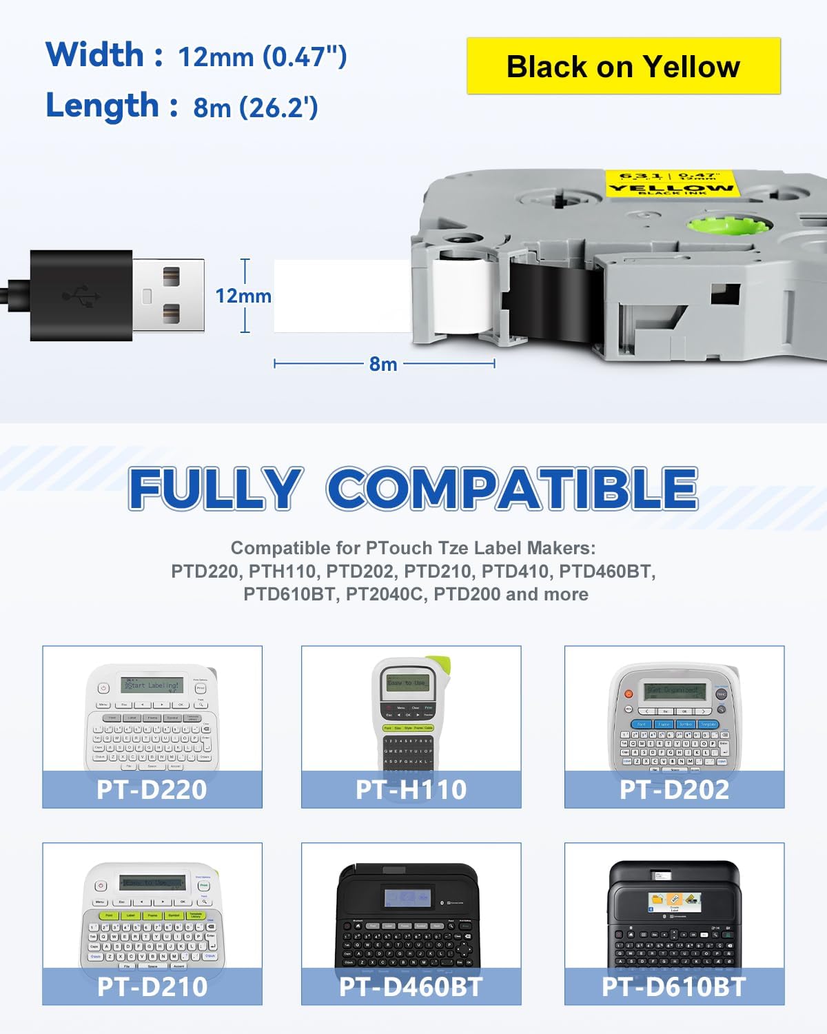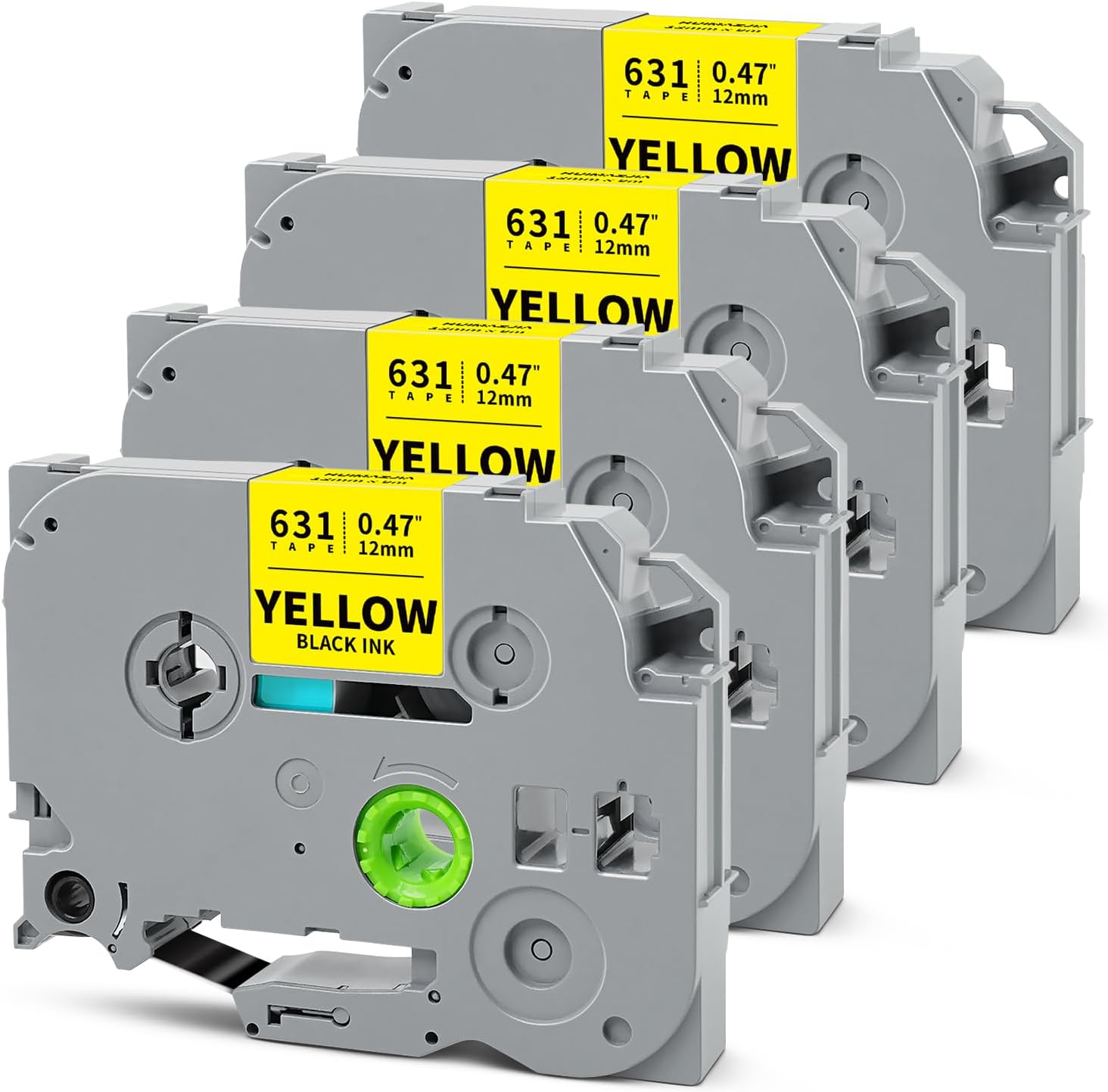 • Packages: 4-Pack 12mm 0.47" yellow label tape compatible with Brother tze-631 12mm 0.47 black on yellow tape. Color: Black on Yellow. Size: 1/2 inch (12mm 0.47") x 26.2 feet (8m)
