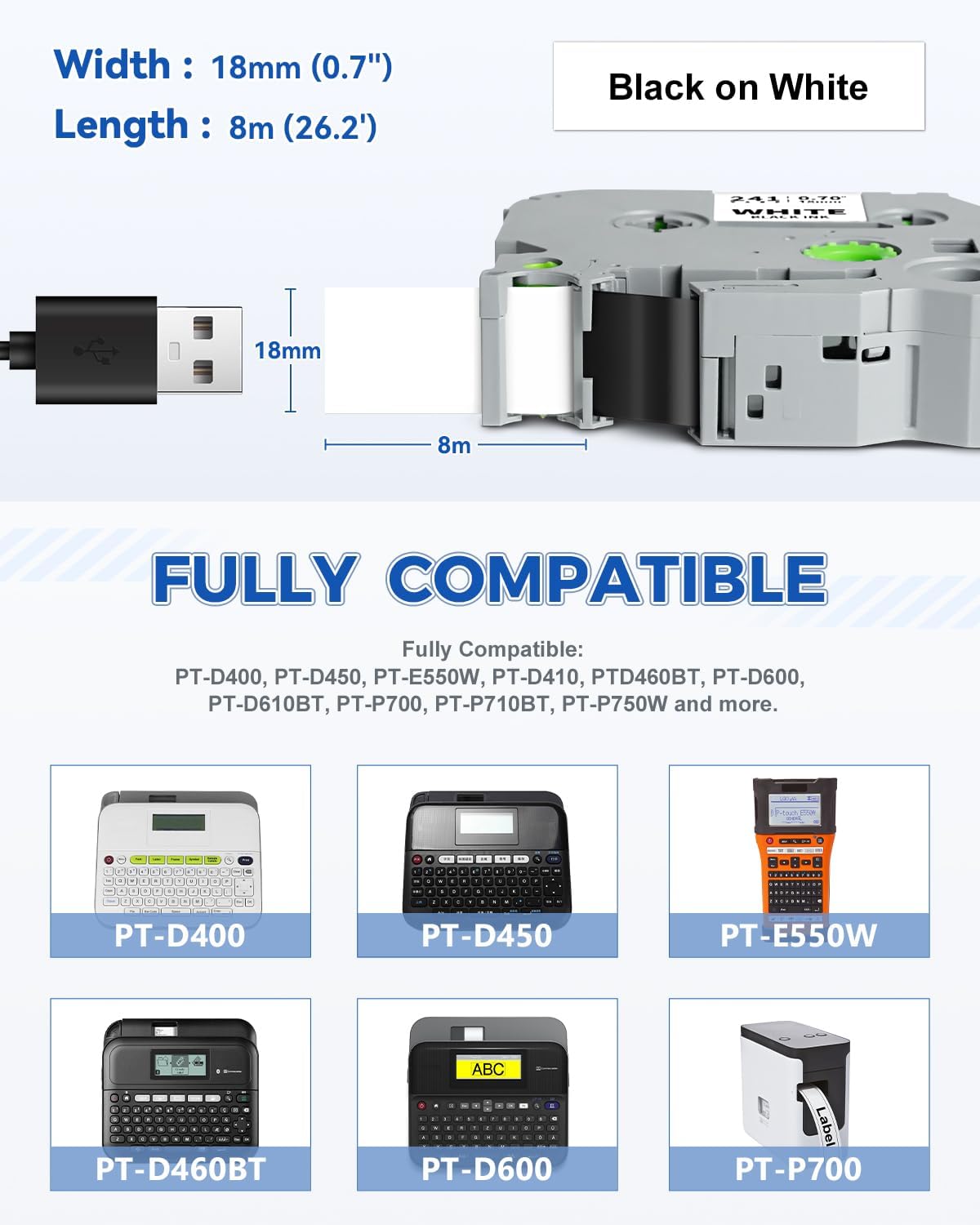 • Packages: 4-Pack 18mm 0.7" white label tape compatible with Brother tze-241 tze tz tape 18mm 0.7 black on white. Color: Black on White. Size: 3/4 inch (18mm 0.7") x 26.2 feet (8m)