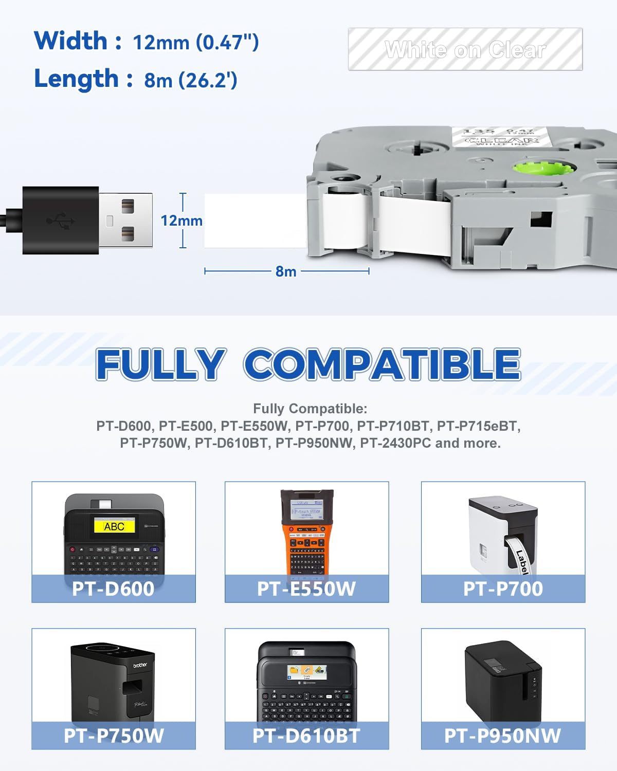 • Packages: 4-Pack 12mm 0.47" clear label tape compatible with Brother tze-135 12mm 0.47 white on clear tape. Color: White on Clear. Size: 1/2 inch (12mm 0.47") x 26.2 feet (8m)