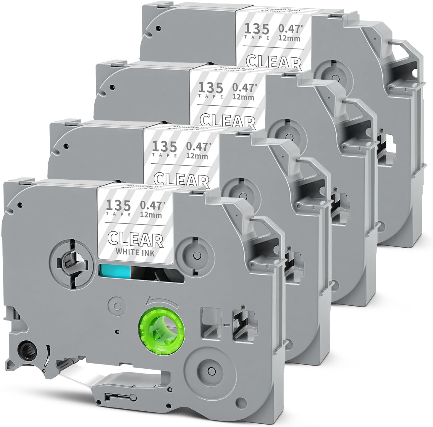 Tze135 12mm 0.47" White on Clear Tape Compatible for Brother Clear Label Tape 12mm Tze-135 Tz-135 P Touch Tz Tze 12mm 1/2" for PTD210 PT-D220 PTD400 PTD600 PT-D610BT Label Maker, 4-Pack