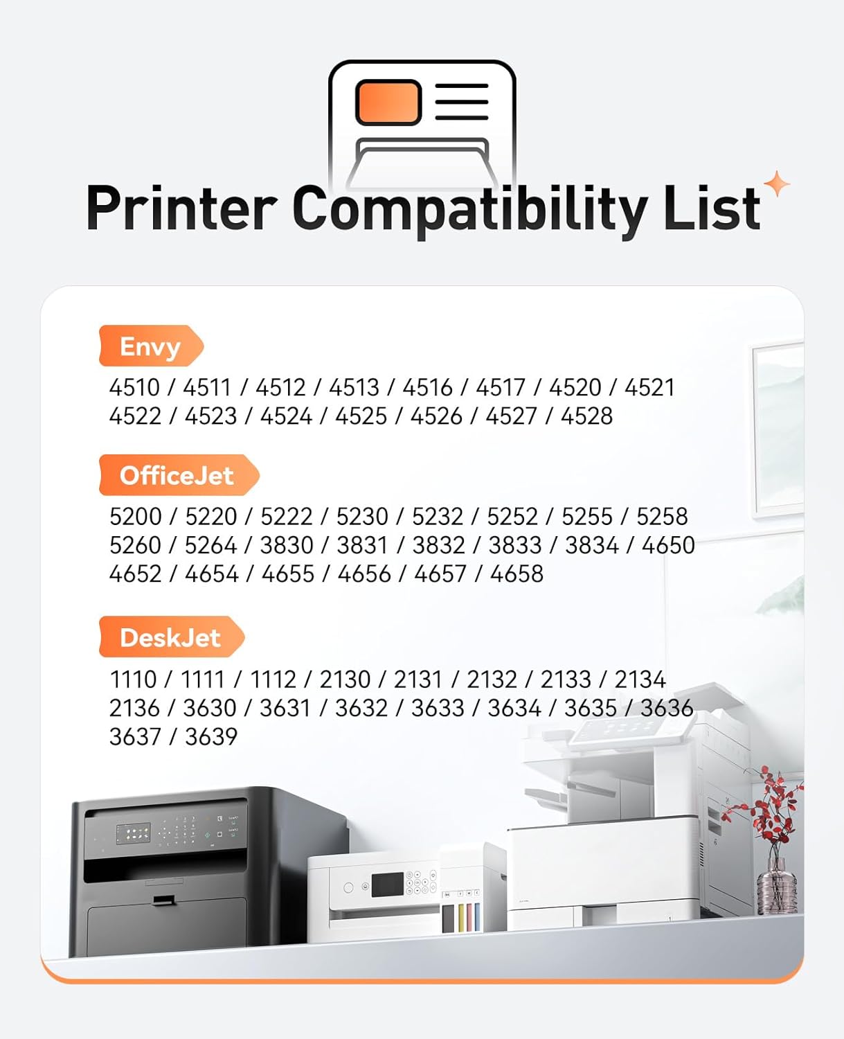 • Compatible with HP Envy series: 4510, 4511, 4512, 4513, 4516, 4517, 4520, 4521, 4522, 4523, 4524, 4525, 4526, 4527, 4528 printers. Compatible with HP OfficeJet series: 5200, 5220, 5222, 5230, 5232, 5252, 5255, 5258, 5260, 5264, 3830, 3831, 3832, 3833, 3834, 4650, 4652, 4654, 4655, 4656, 4657, 4658 printers. Compatible with HP DeskJet series: 1110, 1111, 1112, 2130, 2131, 2132, 2133, 2134, 2136, 3630, 3631, 3632, 3633, 3634, 3635, 3636, 3637, 3639 printers.