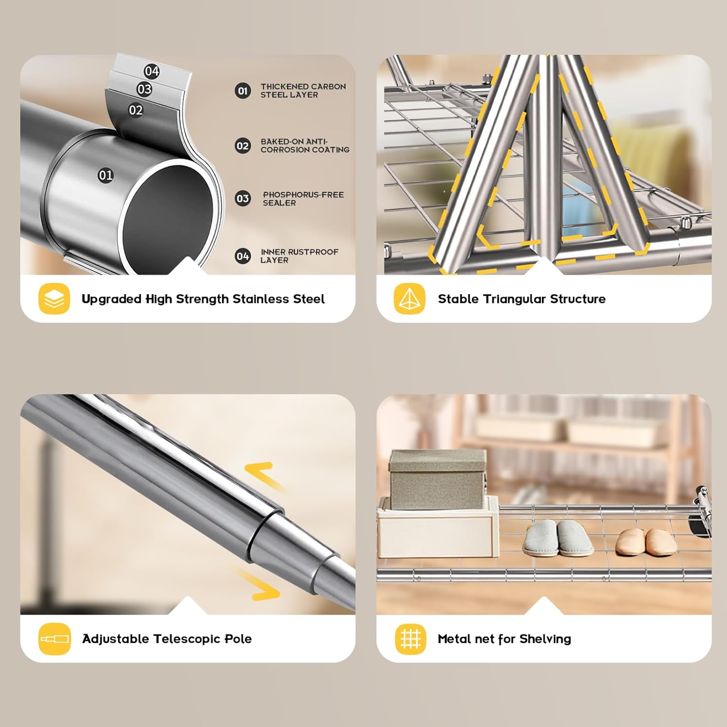 • 3-in-1 Design: This commercial clothing rack serves as a garment rack, shoe rack in one. Ideal for organizing clothes, drying laundry, or displaying items in a retail setting.