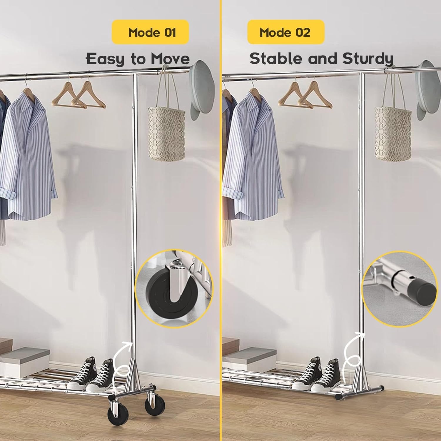 • Heavy-Duty & Stable: With a max load capacity of 550lbs, this all-steel garment rack is solid and sturdy. The E-shape structure provides strong support to prevent wobbling and bending.