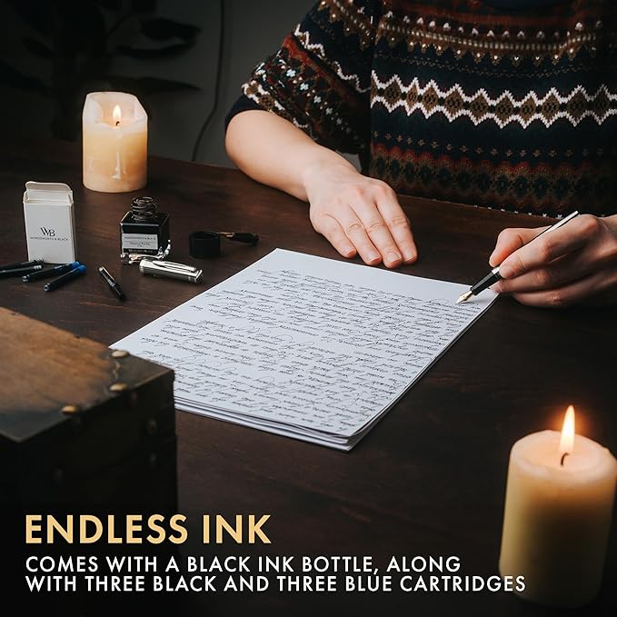 • ✒️Discover The All-inclusive Refillable Fountain Pen Set - Includes luxurious medium nib fountain pen, extra fine replacement nib, ink converter, 3 x blue ink cartridges, 3 x black ink cartridges, and a 25ML Ink Bottle in a Box - ready to be gifted. Each calligraphy ink and fountain pen ink cartridges comes in a plastic re-closable case and will last you at least 2 weeks of regular use. Comes with a complete instruction booklet.