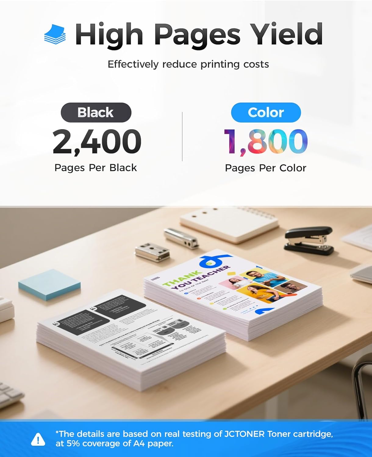 • The latest chip version: The JCTONER toner cartridges are equipped with the latest version of built-in chips, ensuring perfect compatibility between each toner cartridge and the printer. This enables you to print efficiently while maintaining stability and reliability, making installation convenient without the need for manual adjustments. All JCTONER toner cartridges have undergone strict quality testing and have obtained ISO9001 certification. High-quality toner cartridges can meet the demand for high printing volume. The fine toner ensures clear and stain-free printing results and extends the lifespan of the printer. You can purchase with confidence.