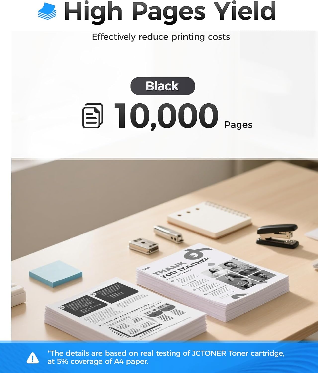 • The latest chip version: The JCTONER toner cartridges are equipped with the latest version of built-in chips, ensuring perfect compatibility between each toner cartridge and the printer. This enables you to print efficiently while maintaining stability and reliability, making installation convenient without the need for manual adjustments. All JCTONER toner cartridges have undergone strict quality testing and have obtained ISO9001 certification. High-quality toner cartridges can meet the demand for high printing volume. The fine toner ensures clear and stain-free printing results and extends the lifespan of the printer. You can purchase with confidence.