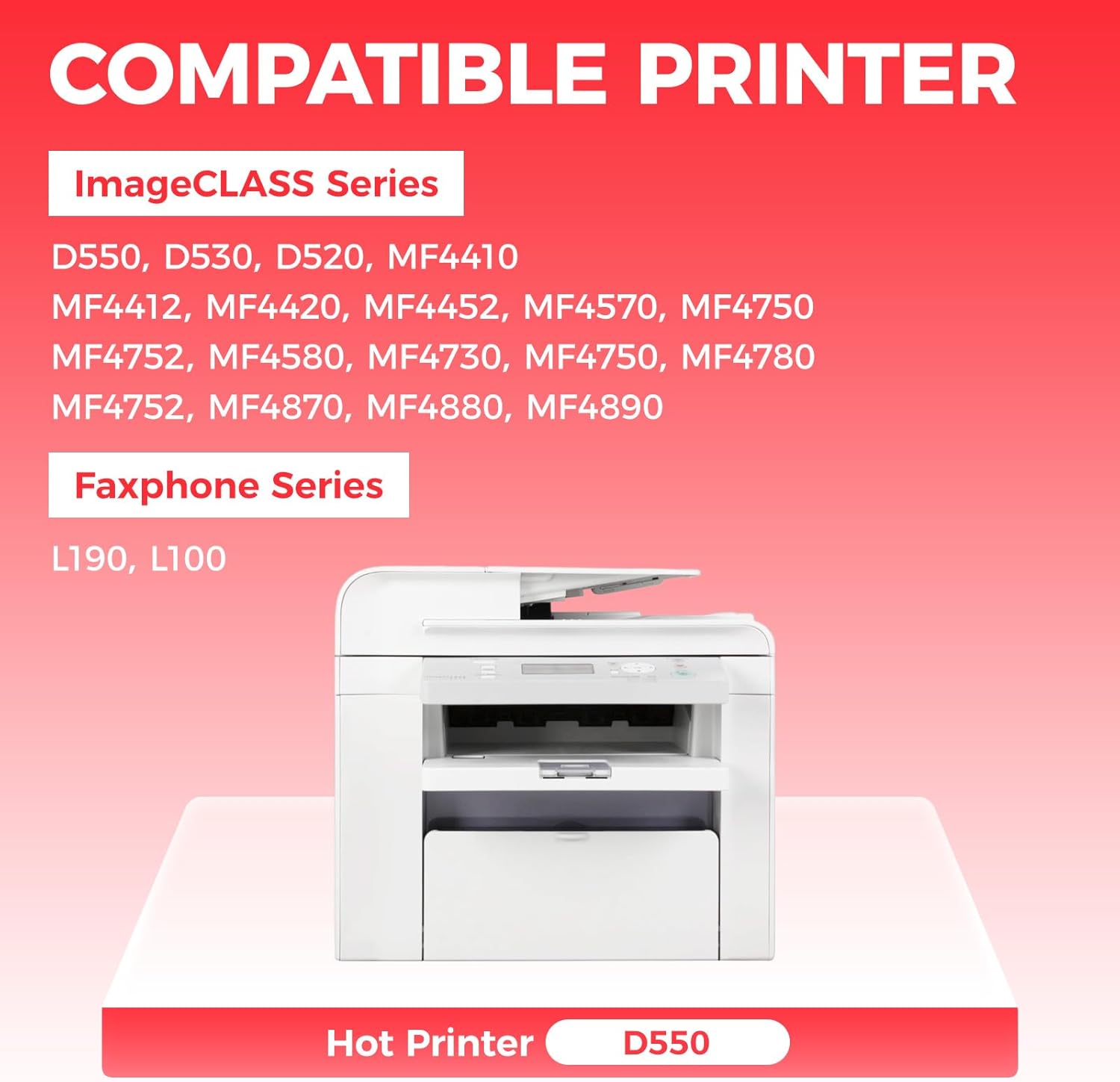 • Compatible Printers: Compatible with Canon ImageCLASS Series:D550 D530 D520 MF4410 MF4412 MF4420 MF4452 MF4570 MF4750, ImageCLASS Series:MF4752 MF4580 MF4730 MF4750 MF4780 MF4752 MF4870 MF4880 MF4890, Faxphone Series:L190 L100 Series Pprinter.