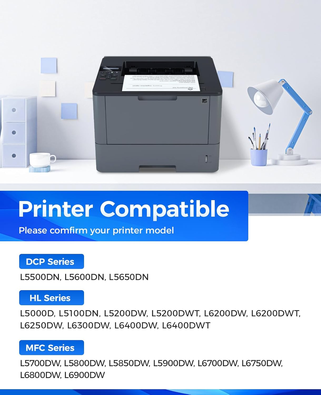• Compatible Printers: Compatible with Brother DCP Printer Series:DCP-L5500DN DCP-L5600DN DCP-L5650DN, HL Printer Series:HL-L5000D HL-L5100DN HL-L5200DW HL-L5200DWT HL-L6200DW HL-L6200DWT HL-L6250DW HL-L6300DW HL-L6400DW HL-L6400DWT, MFC Printer Series:MFC-L5700DW MFC-L5800DW MFC-L5850DW MFC-L5900DW MFC-L6700DW MFC-L6750DW MFC-L6800DW MFC-L6900DW.