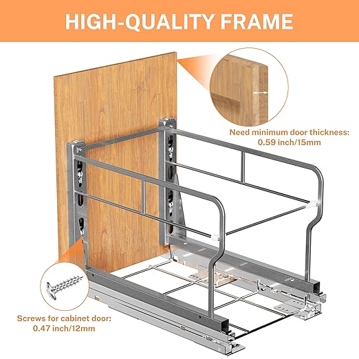 • Premiun Material: Trash cabinet pull out is made of high-quality carbon steel with a powder-coated surface for durability and rust resistance, allowing you to clean it easily with a cloth. The under sink trash can pull out has an enhanced weight capacity, capable of withstanding up to 100 pounds, so there's no need to worry about bending the slides.