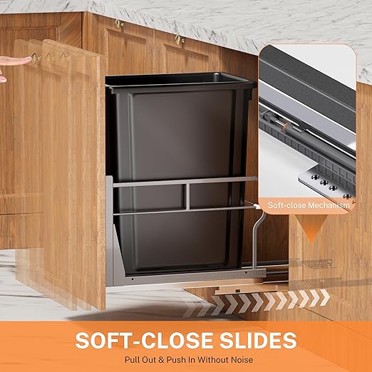 • Smooth Sliding Trash Can: Under cabinet trash can pull out with a soft-close mechanism, allowing the waste container to fully extend outside the cabinet for easy access. Continuous bearings ensure smooth and quiet operation, reducing noise during opening and closing for a more peaceful home environment.