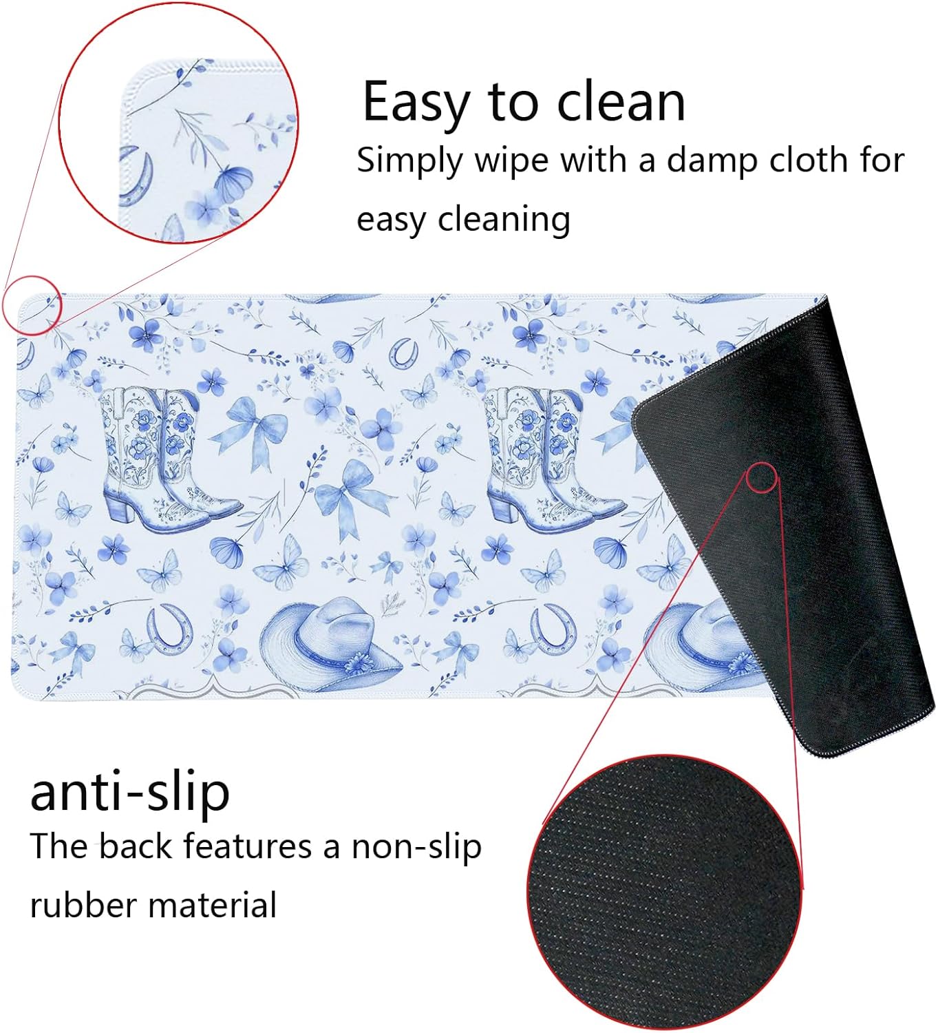 • 【Stylish appearance Designs】We choose the beautiful and fashionable blue bow boot cowgirl pattern, and use excellent printing technology to ensure bright colors. This is a great decoration for your Home Office desk and Dorm table mat, which can add some personality to your workplace and home.