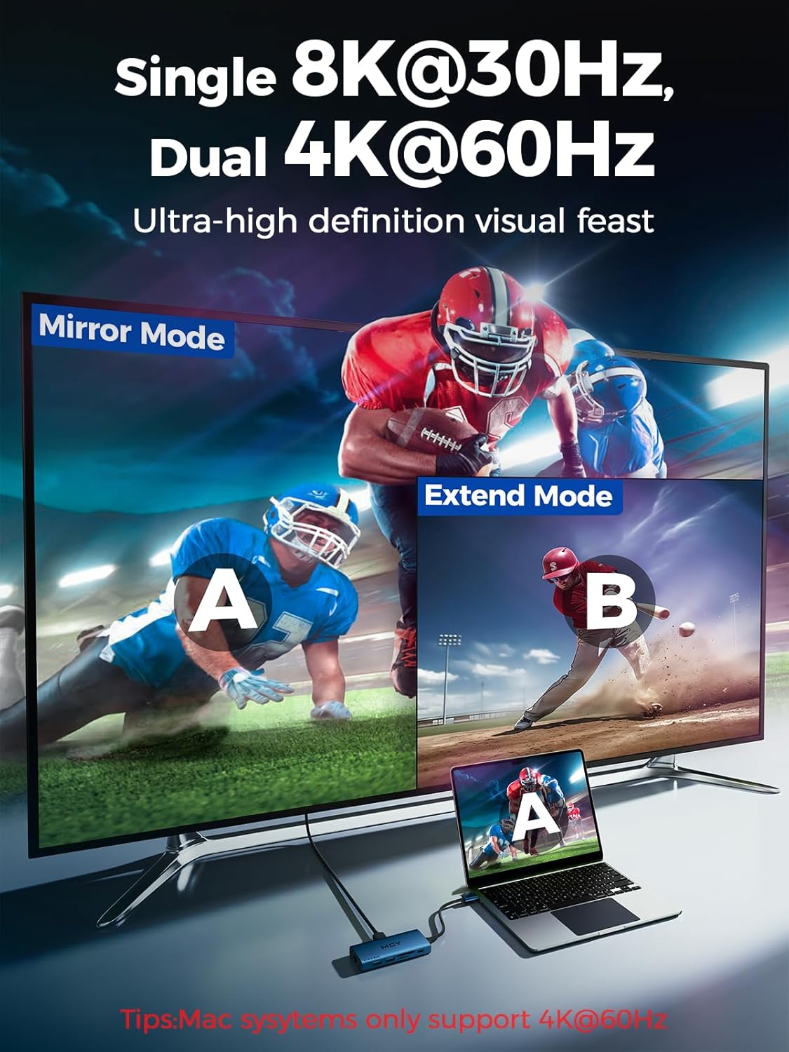 • 【Dual Display Ultra HD Output】The docking station dual hdmi supports single 8K, dual 4K@60Hz mirror/extend modes. Ideal USB C to HDMI adapter for MacBook/Windows laptops. Ultra clear images bring you a visual feast!(Note:1、HDMI1 8K requires DP1.4 protocol PC support (Mac systems only support 4K ). 2、For MAC, the display on both external monitors will be identical.)