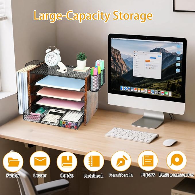 • 【Modern Decor Upgrade】Warm brown wood and matte black steel blend perfectly to create clean, flowing lines. This 5-tier paper tray organizer can enhance your workspace, making work more enjoyable, and is also an ideal gift