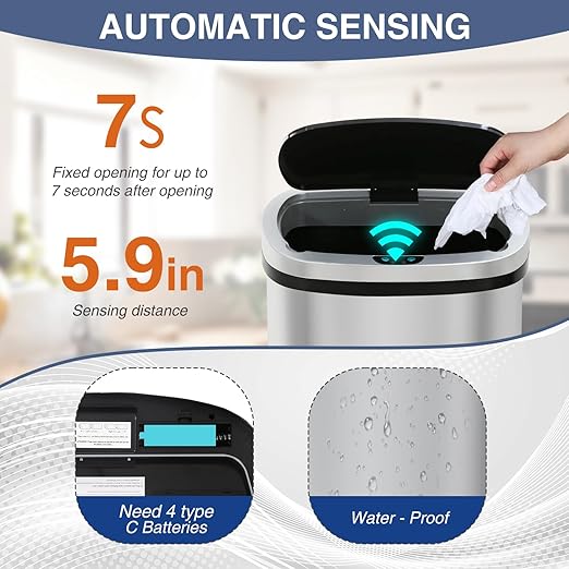 • TOUCHLESS MOTION SENSOR FOR HANDS FREE USE - Equipped with a high-sensitivity infrared sensor, this trash can opens with a simple wave of your hand and closes automatically after 3 seconds. Reduce contact with germs and keep your hands clean, making kitchen tasks more hygienic and convenient.