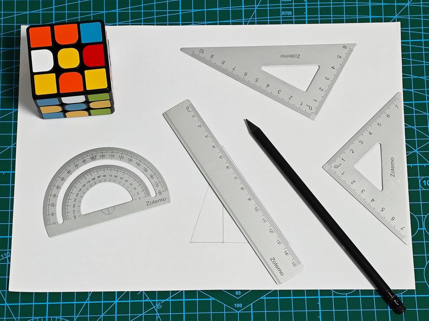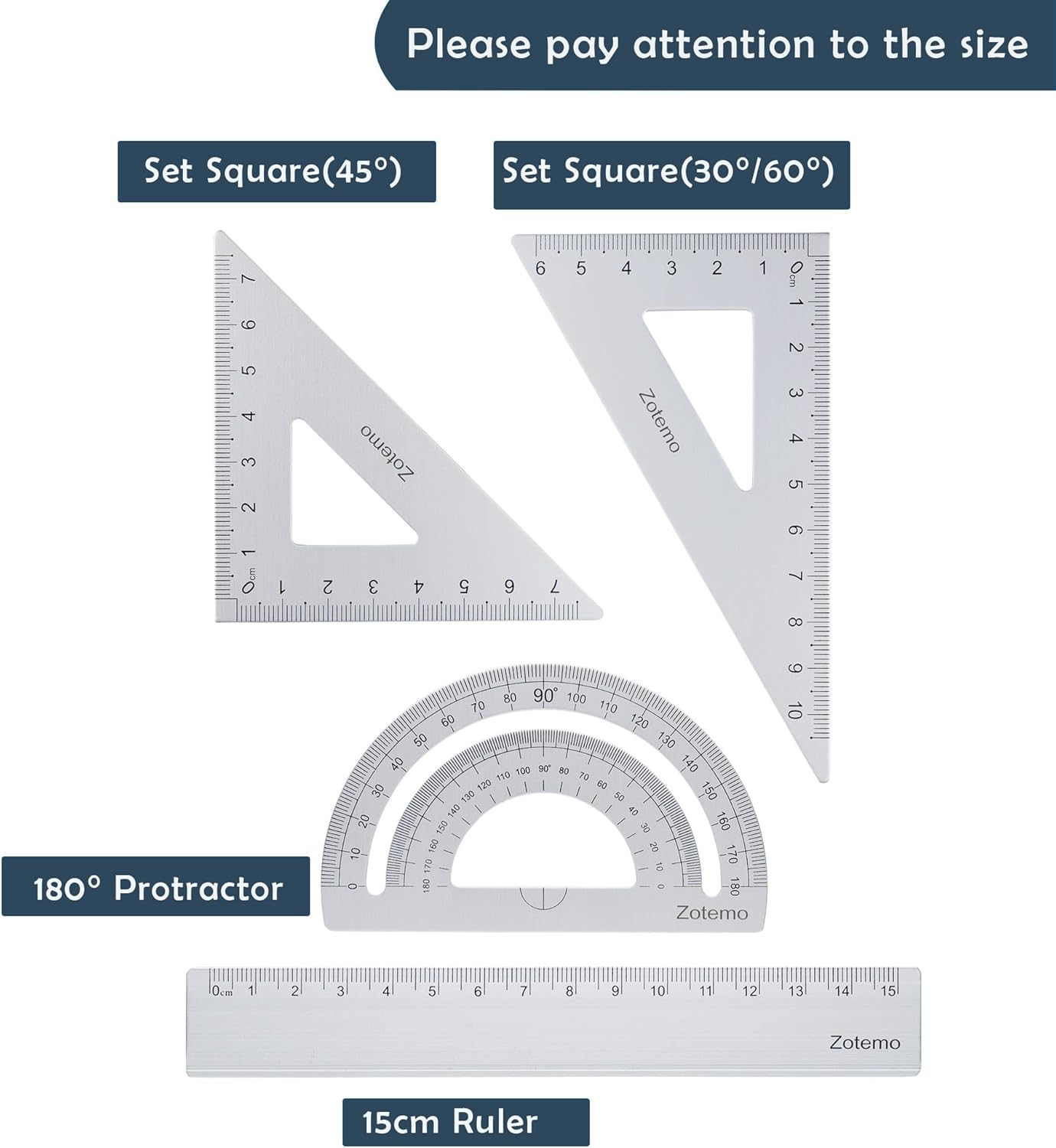 • COMPLETE SET: 4-piece geometry set includes two triangular rulers, one 15cm straight edge ruler, and one aluminum protractor for all your measuring needs