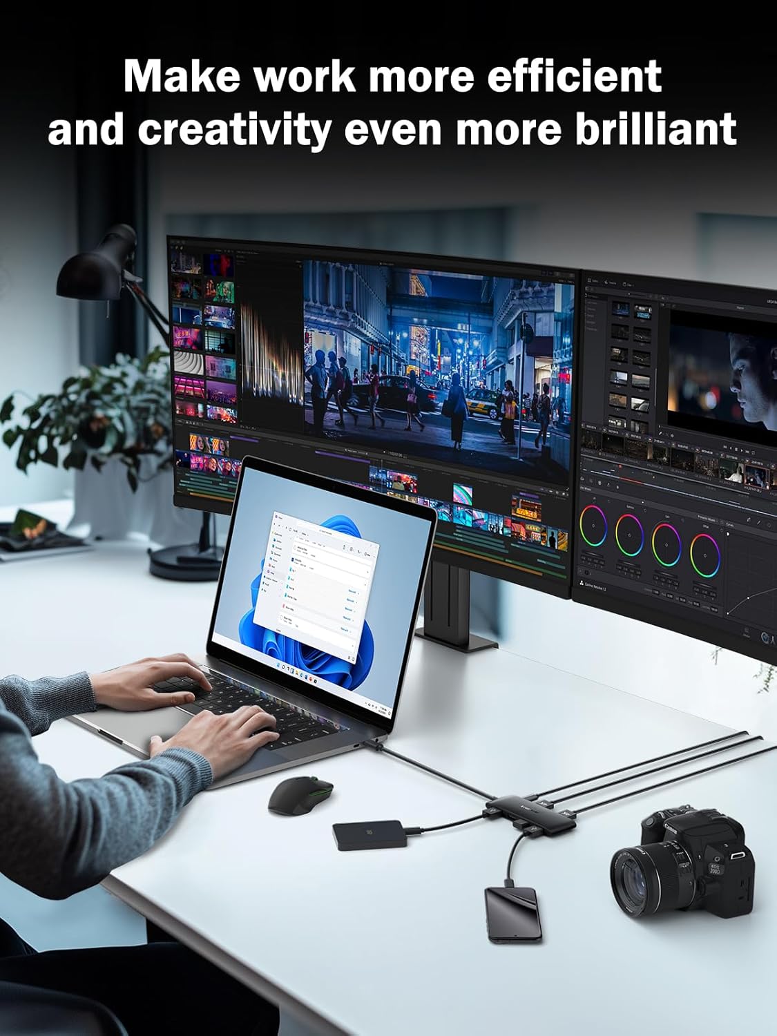 • 【Powerful PD 100W Charging】: This dual monitor docking station support power up to 100W input and max 85W output while charging laptop, no need to worry about power storage, fast and stable, ensuring efficient work. Please note that the charging cable and power adapter are not included. Additionally, the port only supports one-way charging; it does not facilitate data transfer or video output, PD100W requires a 100w+ charger or original charger(100w+ required)
