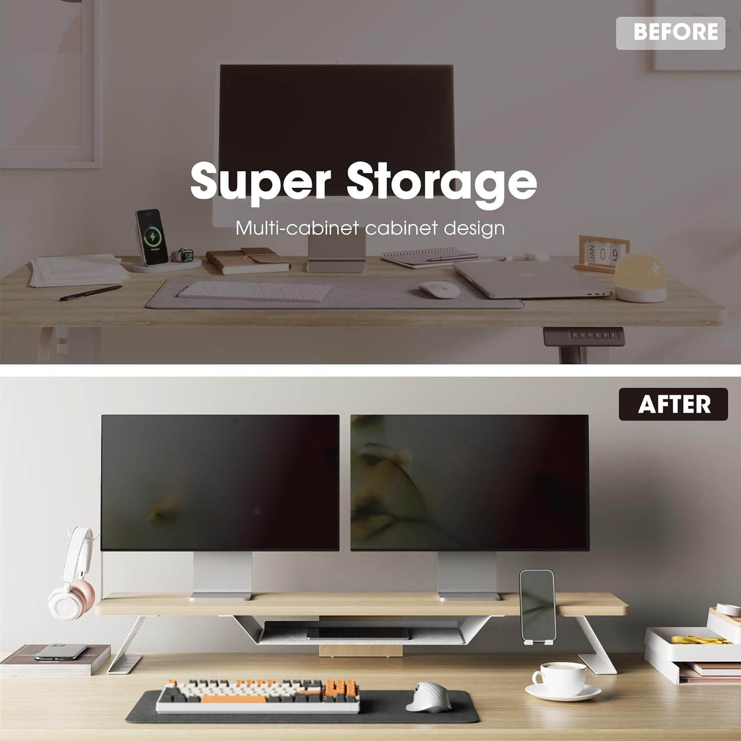 • 【All-in-One Workstation】Fenge desk shelf innovatively combines dual monitor stand with phone stand and headphone holder, meets the needs of multi-device office work. The second shelf (16.5”L×2.1”H ) stores office accessories, maximizes space for a clean, efficient workstation.