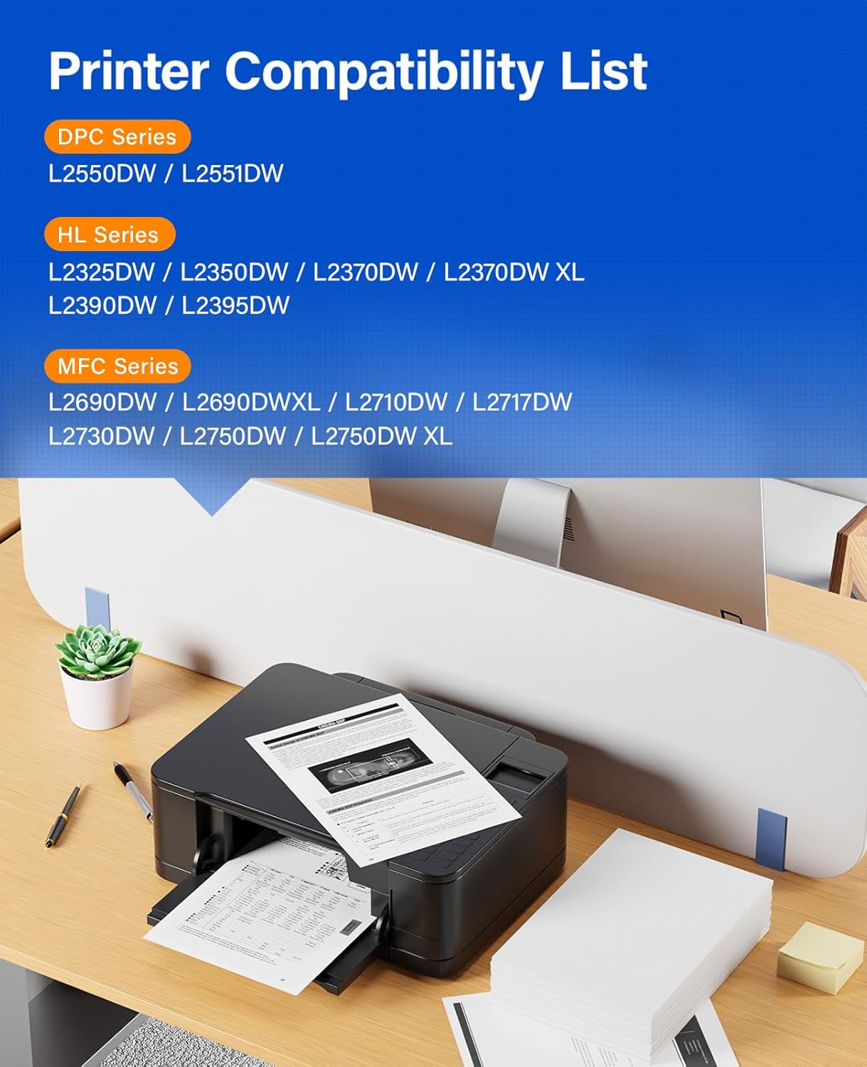 • Compatible Printer: Compatible with Brother DCP-L2550DW, DCP-L2551DW,HL-L2325DW, HL-L2350DW, HL-L2370DW, HL-L2370DW XL, HL-L2390DW, HL-L2395DW, MFC-L2690DW, MFC-L2690DWXL, MFC-L2710DW, MFC-L2717DW, MFC-L2730DW, MFC-L2750DW, MFC-L2750DW XL (Please check that your printer model matches the printer model of this toner cartridge before placing an order)