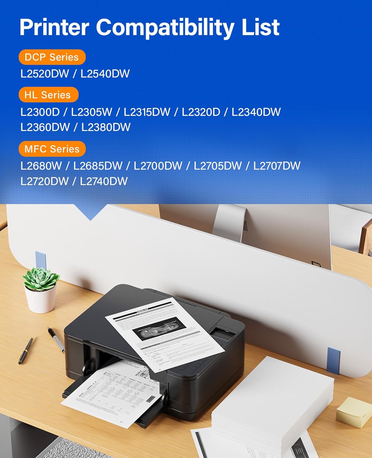 • Compatible Printer: Compatible with Brother DCP-L2520DW, DCP-L2540DW, HL-L2300D, HL-L2305W, HL-L2315DW, HL-L2320D, HL-L2340DW, HL-L2360DW, HL-L2380DW, MFC-L2680W, MFC-L2685DW,MFC-L2700DW, MFC-L2705DW, MFC-L2707DW, MFC-L2720DW, MFC-L2740DW (Please check that your printer model matches the printer model of this toner cartridge before placing an order)