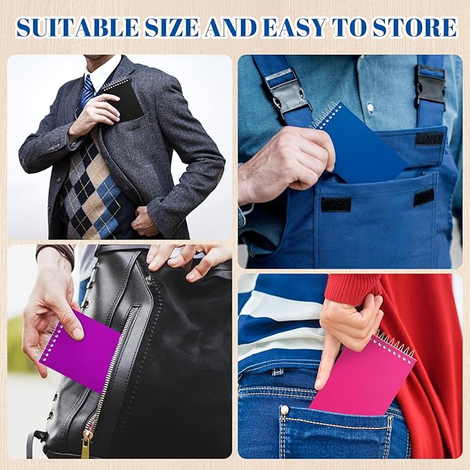 • Top Spiral Bound: each pocket memo pad adopts top spiral binding, so the page can lay flat for a more comfortable writing condition for right or left handed users; And the unobstructed spiral binding design won't hang up on clothes or backpacks, very thoughtful