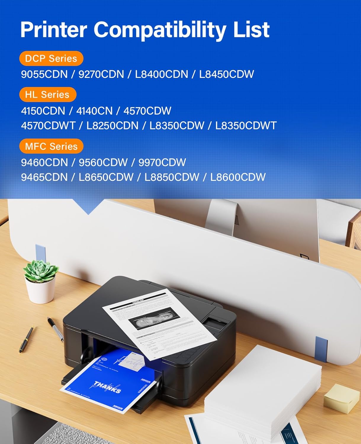 • Compatible Printer: Compatible with Brother DCP-9055CDN, DCP-9270CDN,DCP-L8400CDN, DCP-L8450CDW, HL-4150CDN, HL-4140CN, HL-4570CDW, HL-4570CDWT, HL-L8250CDN, HL-L8350CDW, HL-L8350CDWT, MFC-9460CDN, MFC-9560CDW, MFC-9970CDW, MFC-9465CDN, MFC-L8650CDW, MFC-L8850CDW, MFC-L8600CDW (Please check that your printer model matches the printer model of this toner cartridge before placing an order).