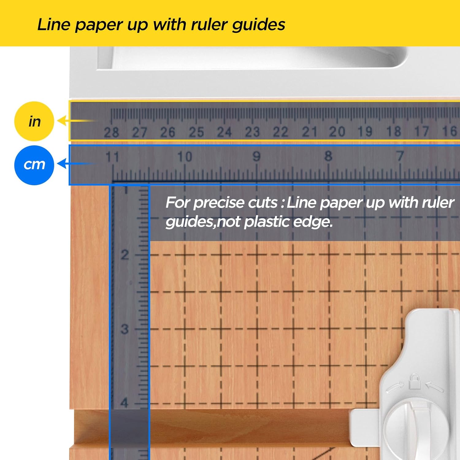 • Precision Cutting with Adjustable Guide: The alignment grid ensures precision, while the adjustable paper guide secures the paper in place for accurate cuts. The dual-scale ruler, marked in inches and centimeters, aids in measurement before cutting.