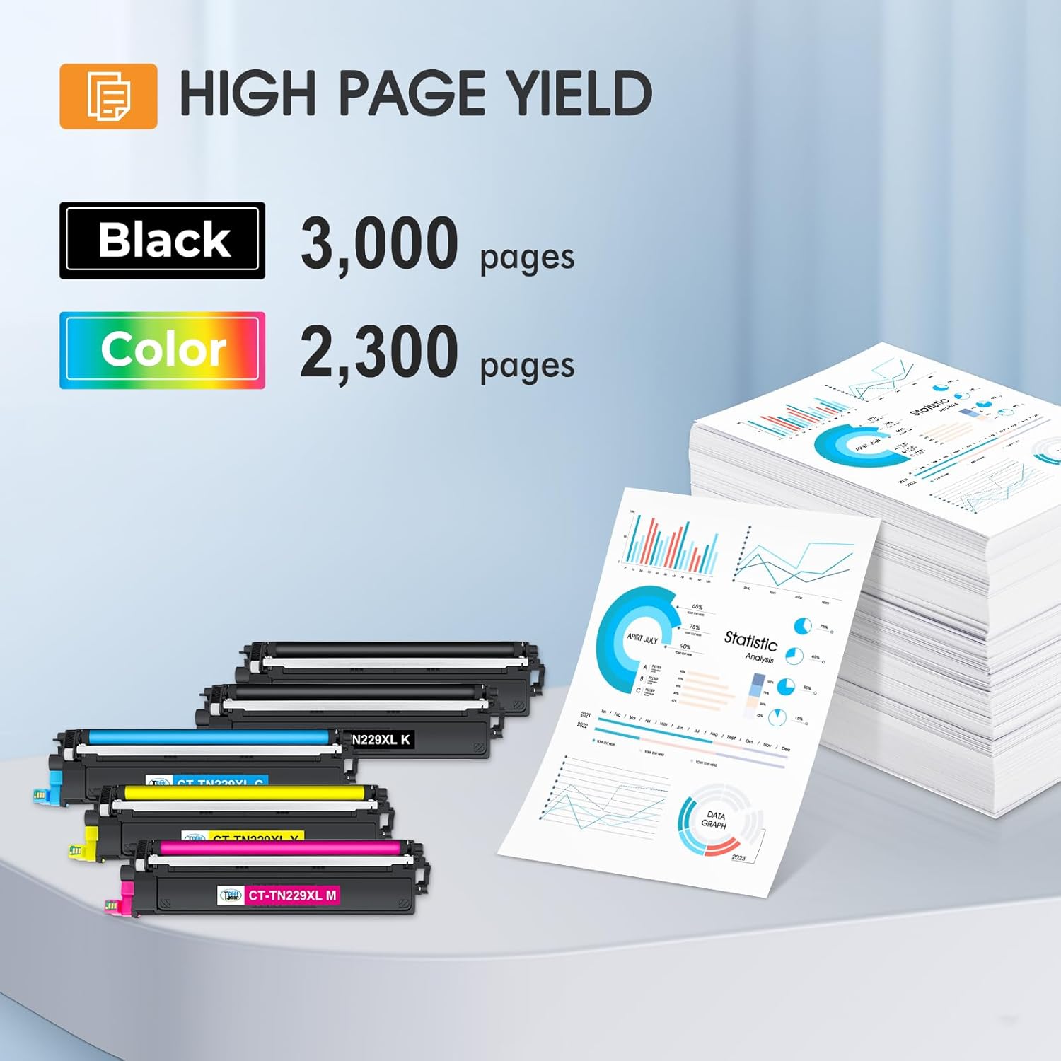 • Page Yield: 3,000 pages for TN229XL black toner and 2,300 pages for each TN229XL color toner (Letter/A4, at 5% coverage)