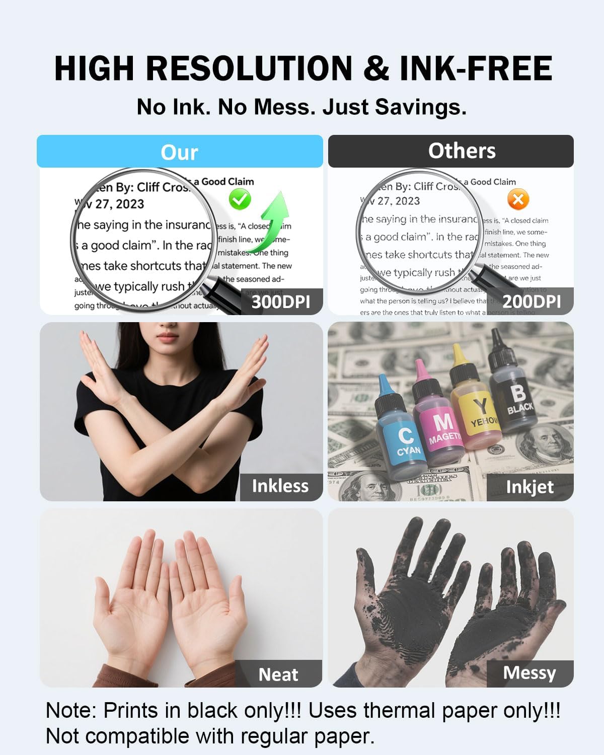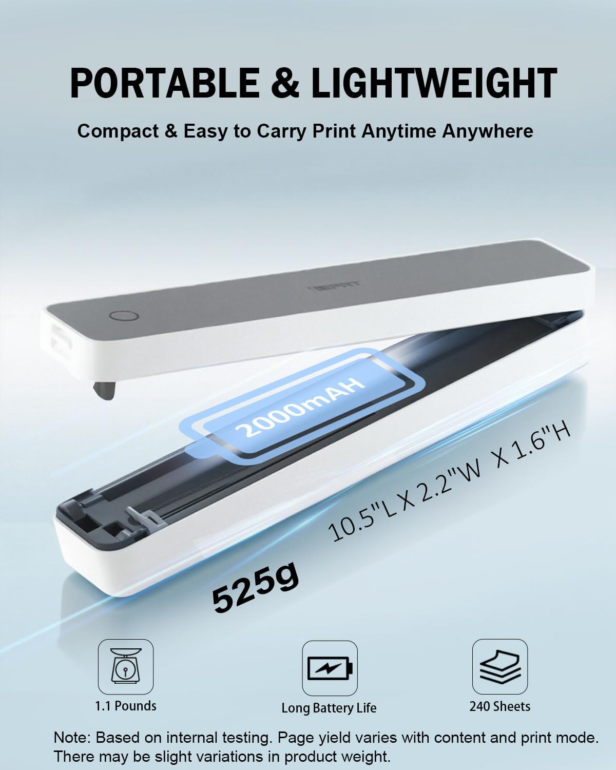 • Ultra Light Travel Printer: At just 1.1lb (526g) and 1.6 inches thick, this portable thermal printer fits easily into your backpack or work bag. Whether you're on a business trip, campus, café, or coworking space, print contracts, lecture notes, or documents on the go—no desk needed!