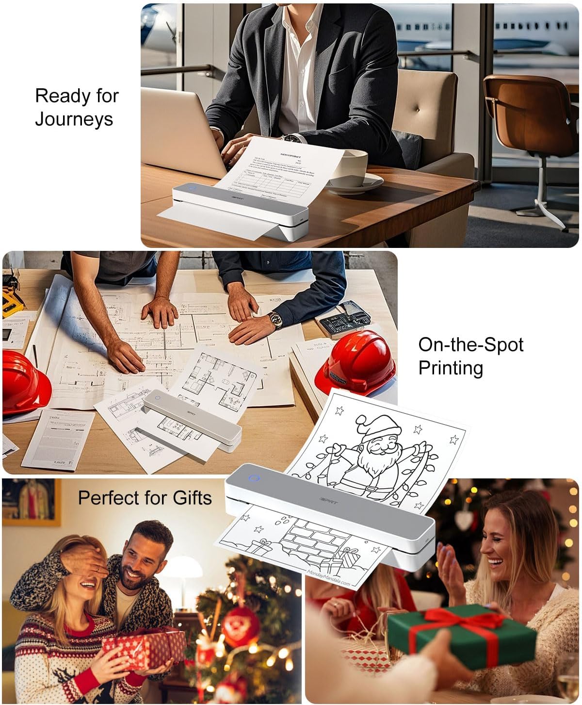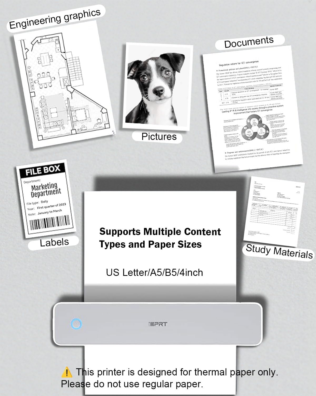 • Gift Worthy Printer for Work or Study:This compact thermal printer supports US Letter/ A4/ A5/ B5 / 4-inch paper sizes. Print PDFs, notes, receipts, and reports on demand. Ideal for students, digital nomads, field professionals, or anyone needing portable printing—makes a practical and thoughtful gift too.
