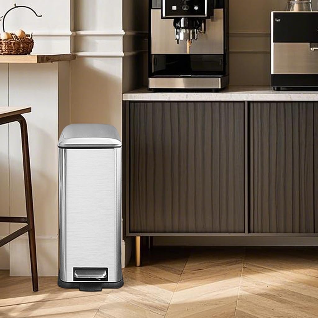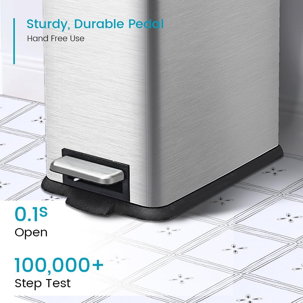 • 12 Gallon Step Trash Can: Our durable stainless steel foot pedal is built to last over 100,000 times, ensuring smooth and reliable operation for years to come.