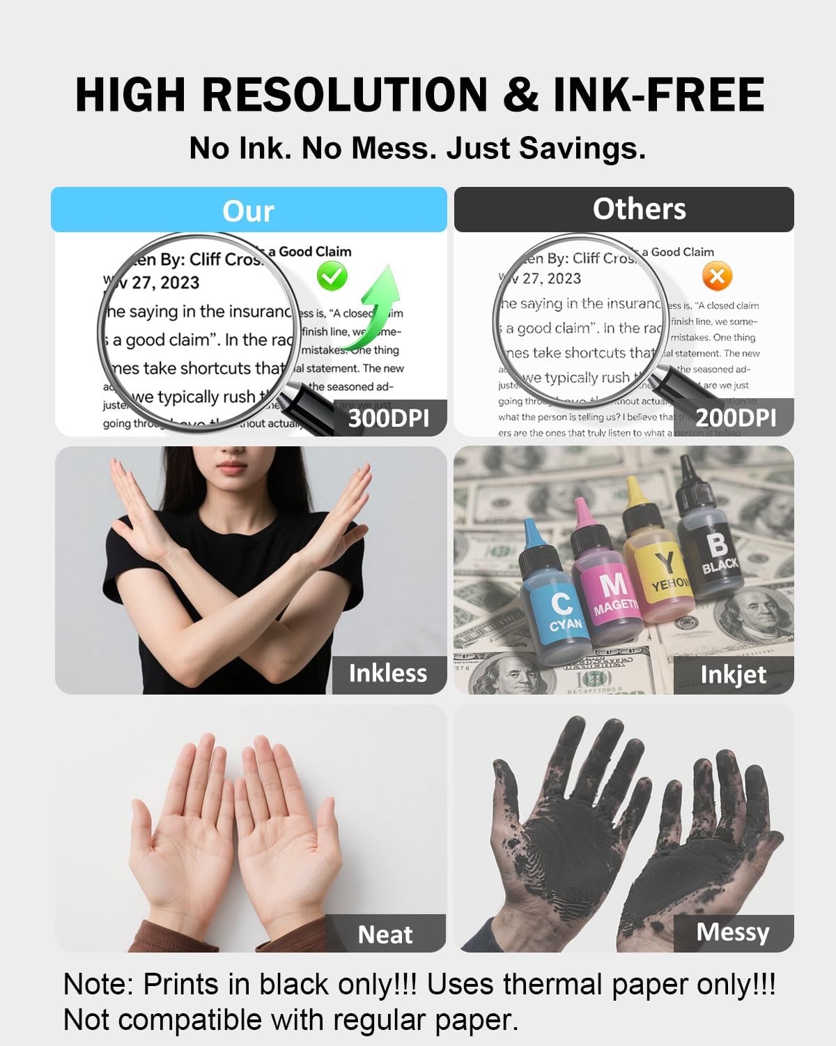• Ultra Light Travel Printer– At just 1.1lb (526g) and 1.6 inches thick, this portable thermal printer fits easily into your backpack or work bag. Whether you're on a business trip, campus, café, or coworking space, print contracts, lecture notes, or documents on the go—no desk needed!