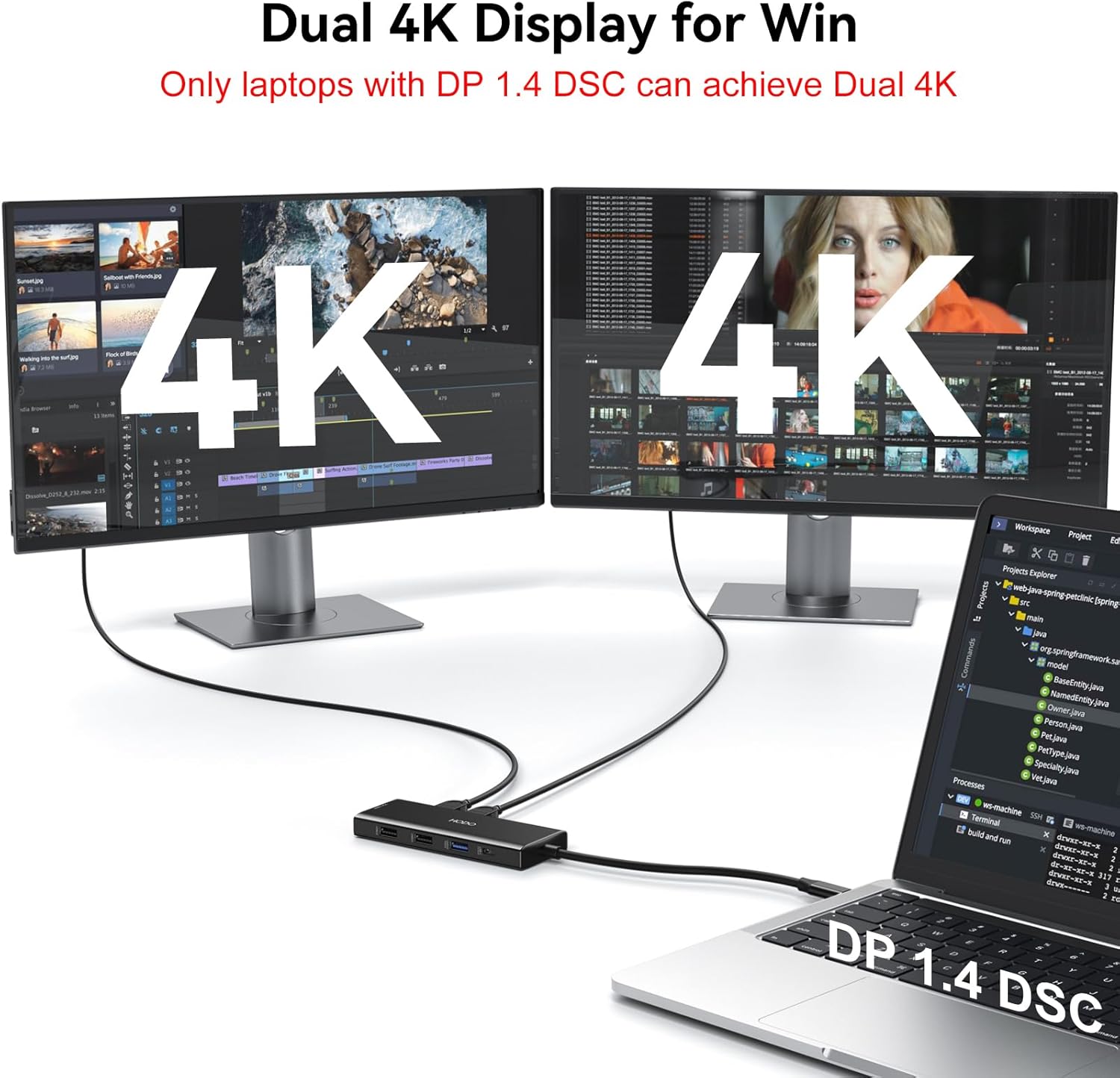 • Laptop Docking Station 4K Display Adapter: The USB C Docking Station Dual HDMI Splitter with 4 video output ports: 2 HDMI+DP+VGA. For single display, HDMI can reach 8K@30HZ or 4K@144HZ; For dual display and triple display, Can output up to 4K Dual/Triple Display videos(For laptop with DP 1.4 DSC); For quadruple display, Dual HDMI, DP, and VGA all are 1080@60Hz. Please make sure your laptop specification support DP1.4 signal output. If the VGA port is connected, it will affect the resolution of all displays up to 1080P only