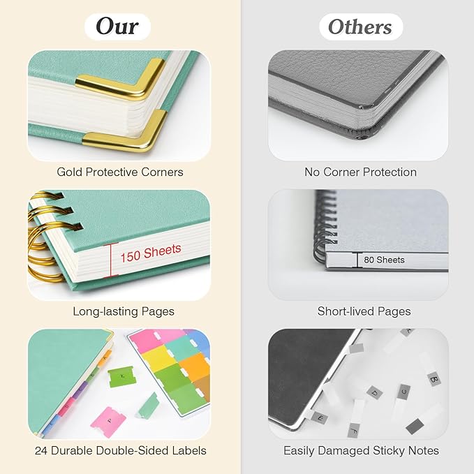 • 【Premium Leather Cover & Strong Binding】Spiral notebook showcases a luxurious leather hard cover, complete with golden corner protectors for extra durability. Its professional design not only looks stylish but is built to last. The strong metal double spiral binding allows for a full 360° lay-flat design, making writing more comfortable and efficient. Whether flipping through or laying the Subject notebook flat, this design guarantees a smooth writing experience.