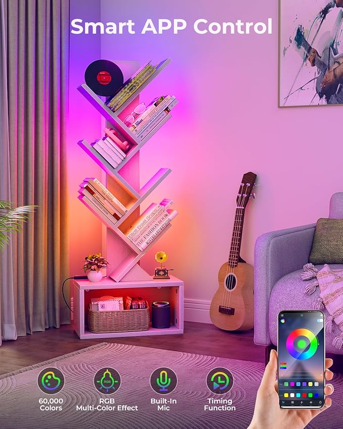 • 【RGBIC LED Lights】This corner shelf with light strips offering up to 60,000 colors and various dynamic modes; Adjust brightness, colors, and patterns via remote control or APP to match any atmosphere; Perfect for living room, bedroom, and game room