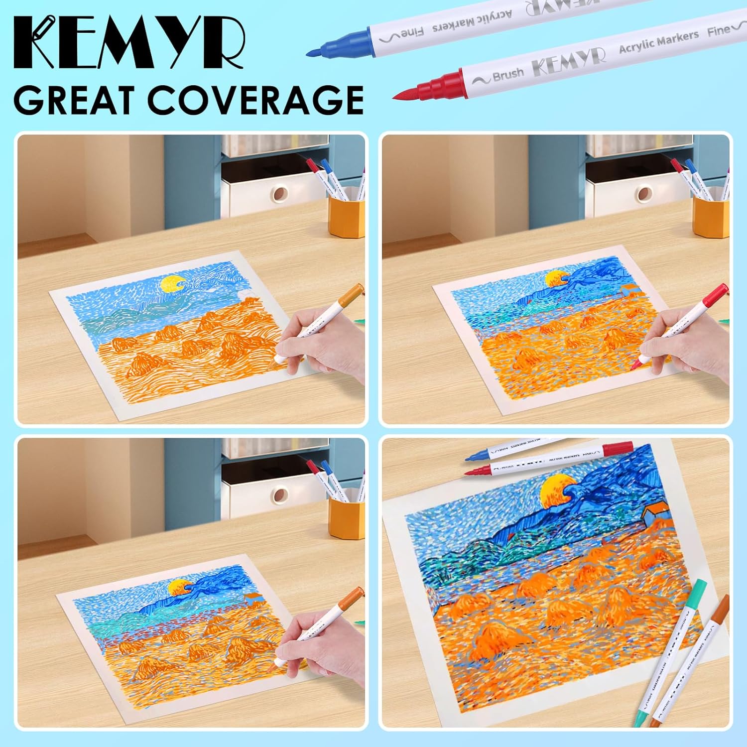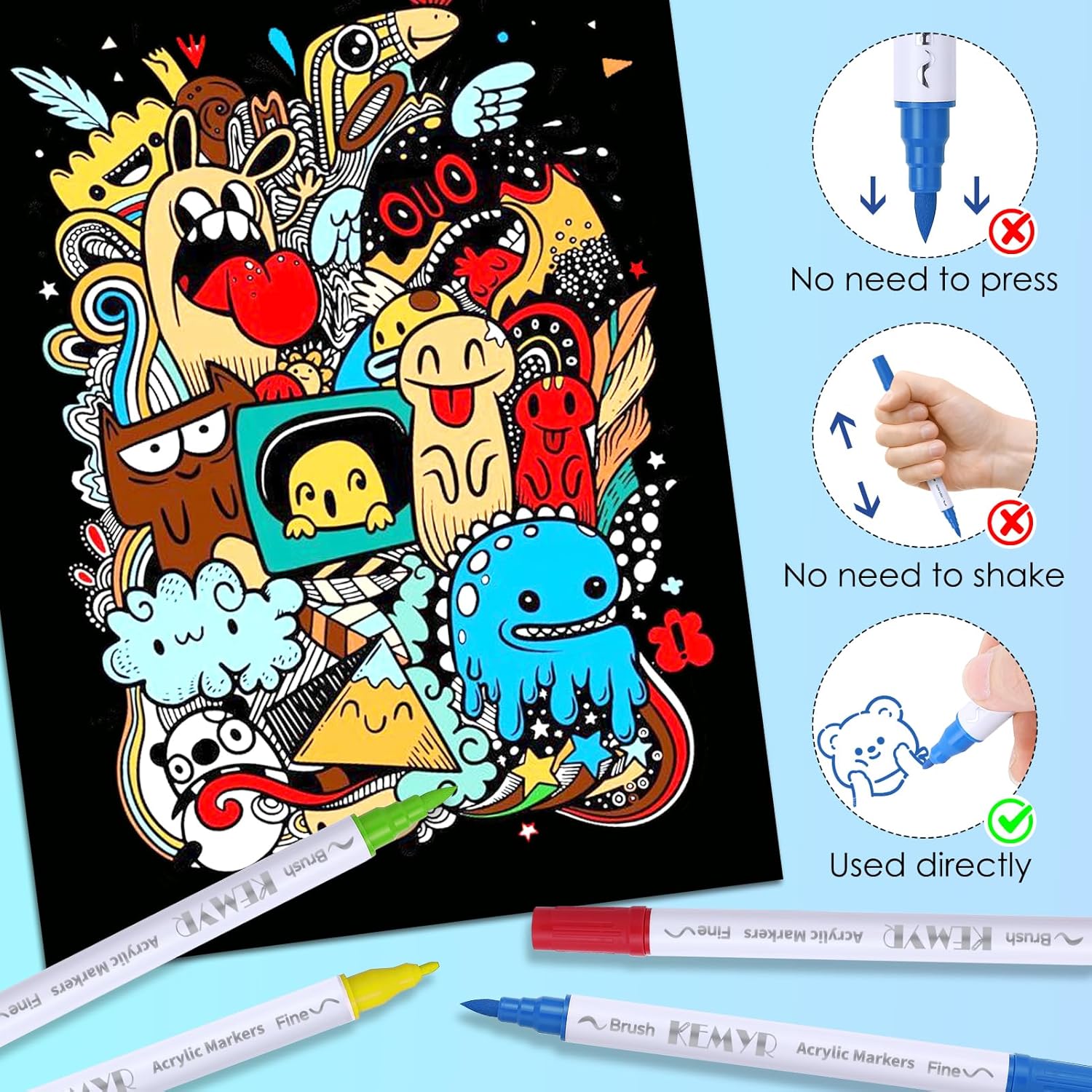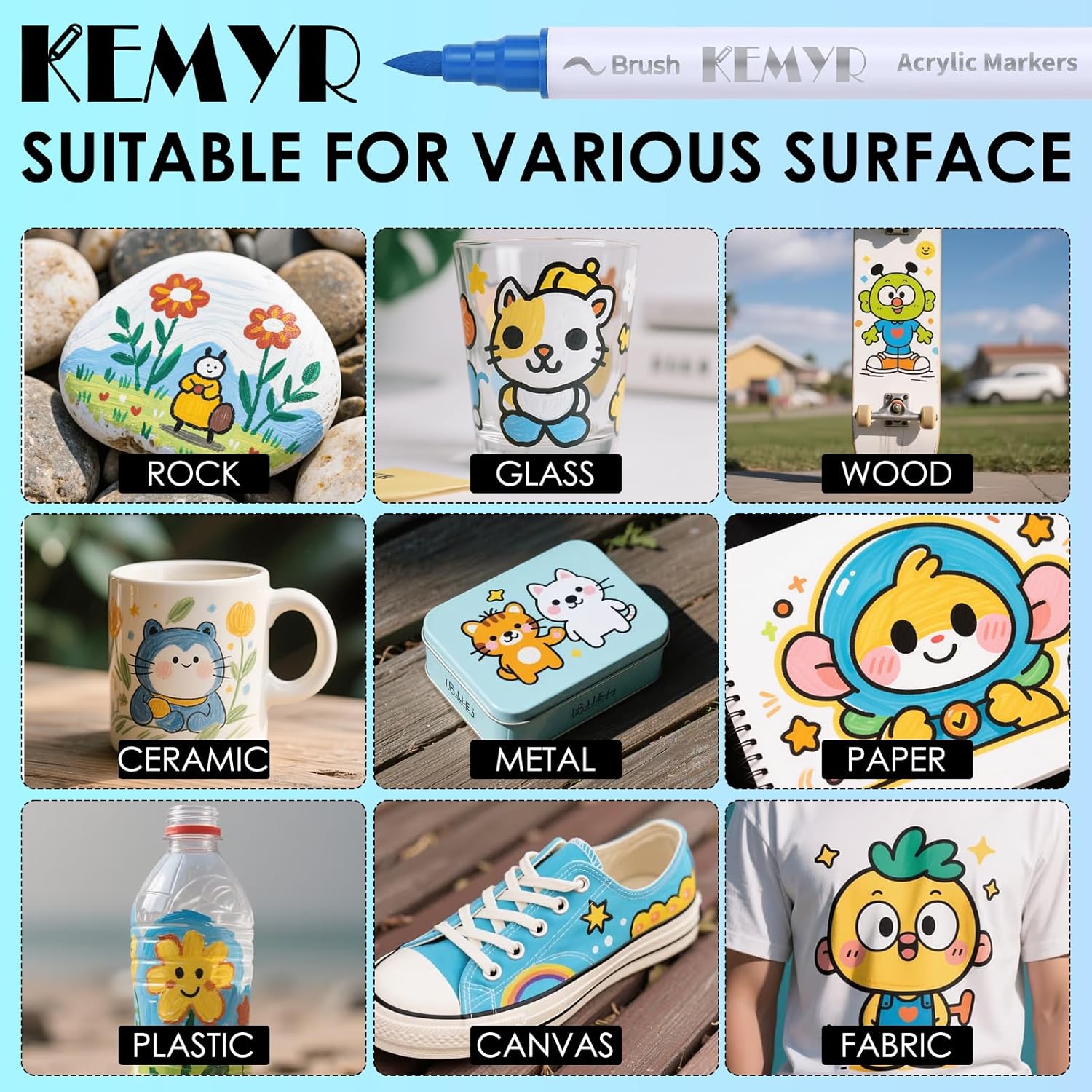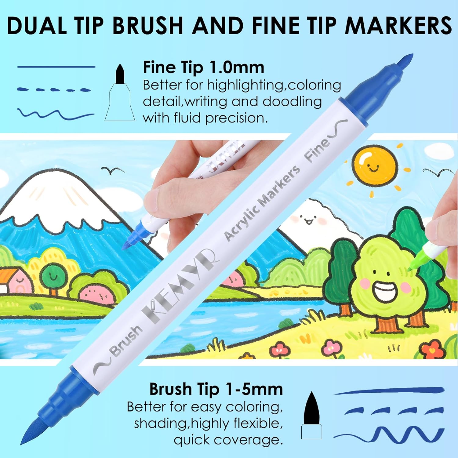• Dual Tip Acrylic Paint Pens----Each KEMYR pen is equipped with a 1 mm fine tip for lines and details work, and a 1 - 5 mm brush tip for filling large areas and coloring. By changing the brush pressure, you can create different strokes, saving the trouble of changing tips.