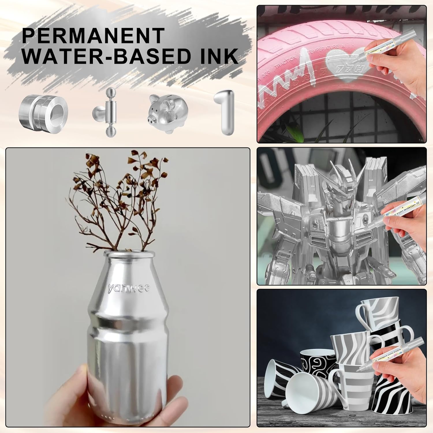 Paint Markers Paint Pens - 2 Pack Dual Tip Acrylic Permanent Marker (0.7mm & 3mm), Non-Toxic, Water-Based for Art Painting, Stone, Ceramic, Glass, Wood, Fabric, Metal, DIY Crafts (Silver)