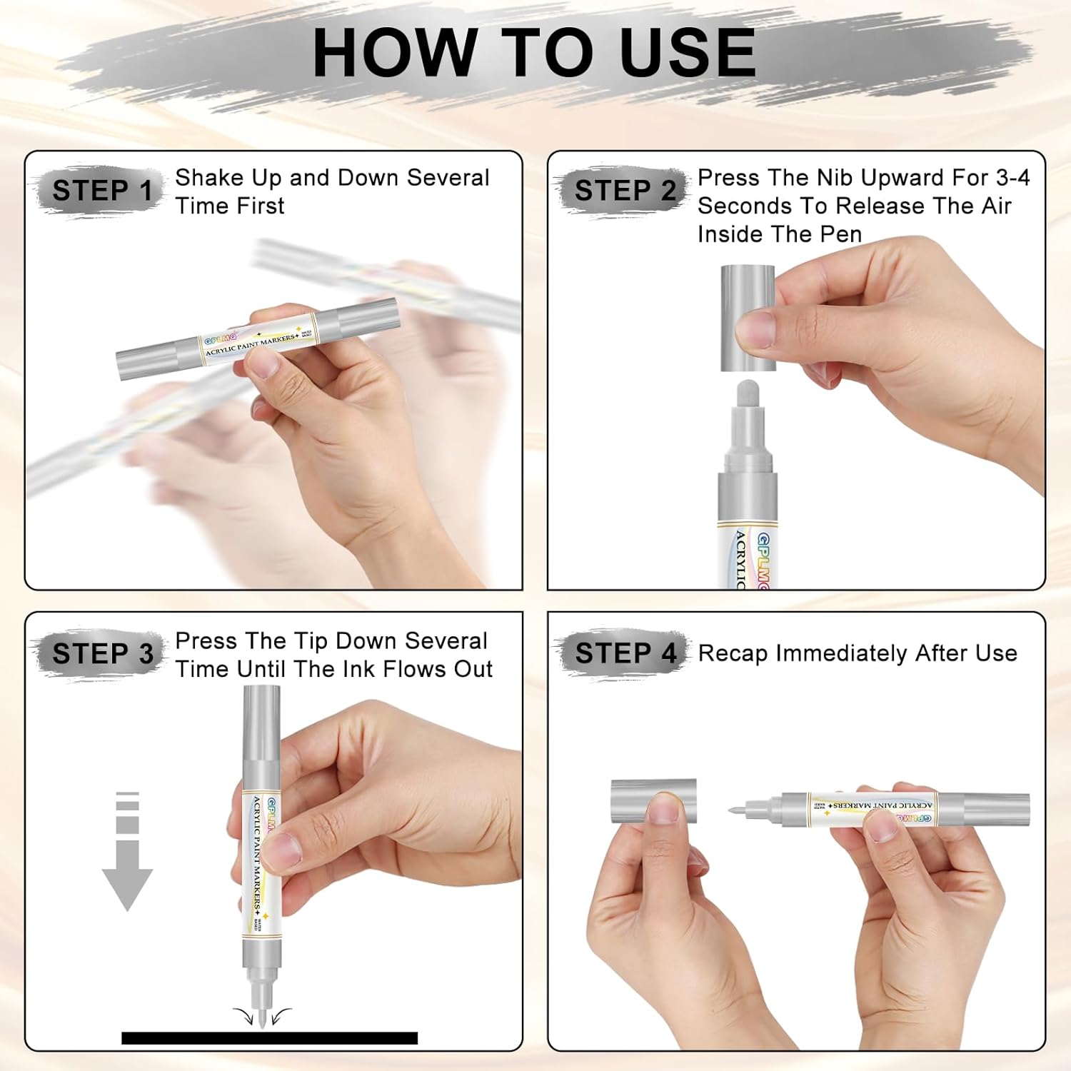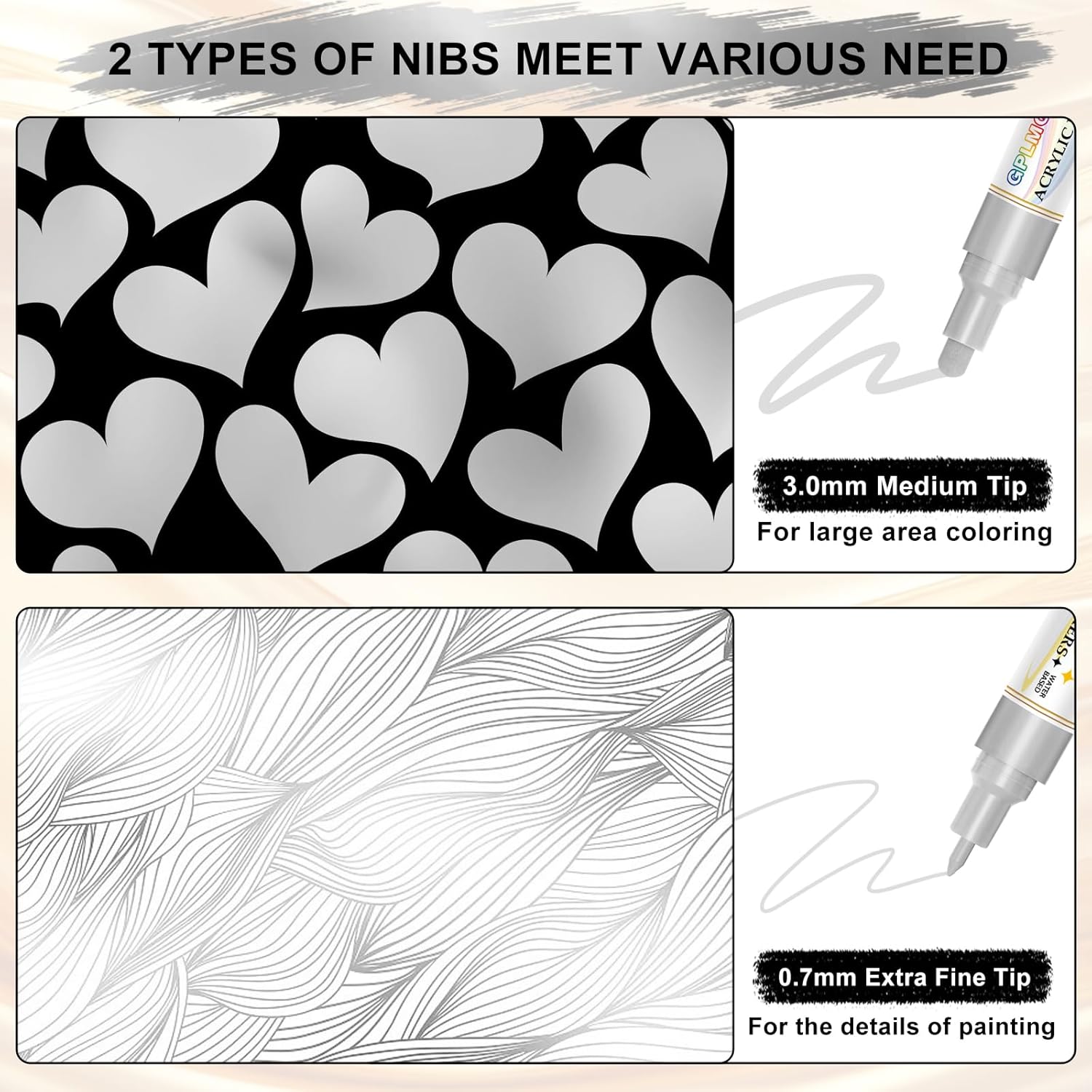 • Dual-Tip Design for Versatility: Each paint pen features a 0.7mm fine tip for detailed lines and a 3mm medium tip for filling larger areas, making it perfect for outlining, lettering, and adding intricate details to your DIY projects