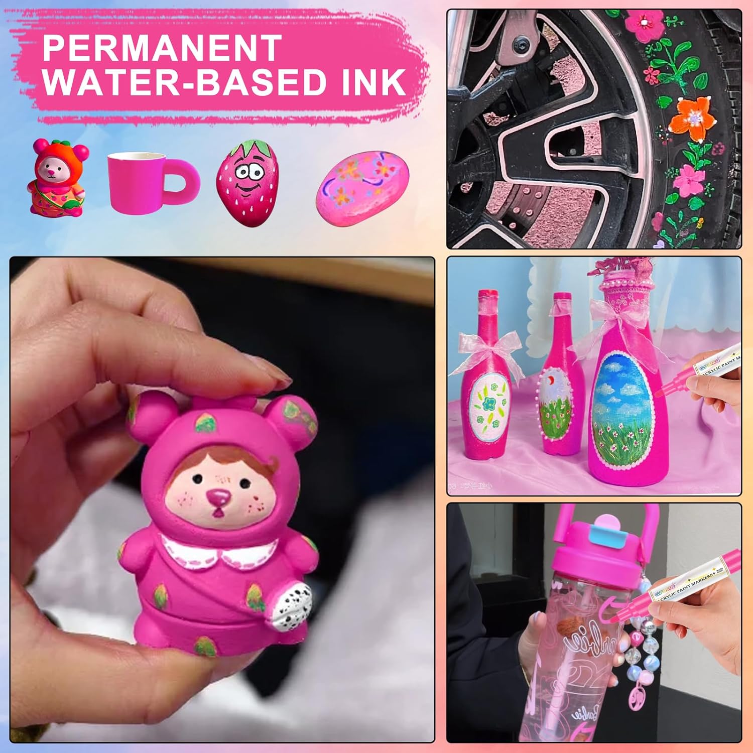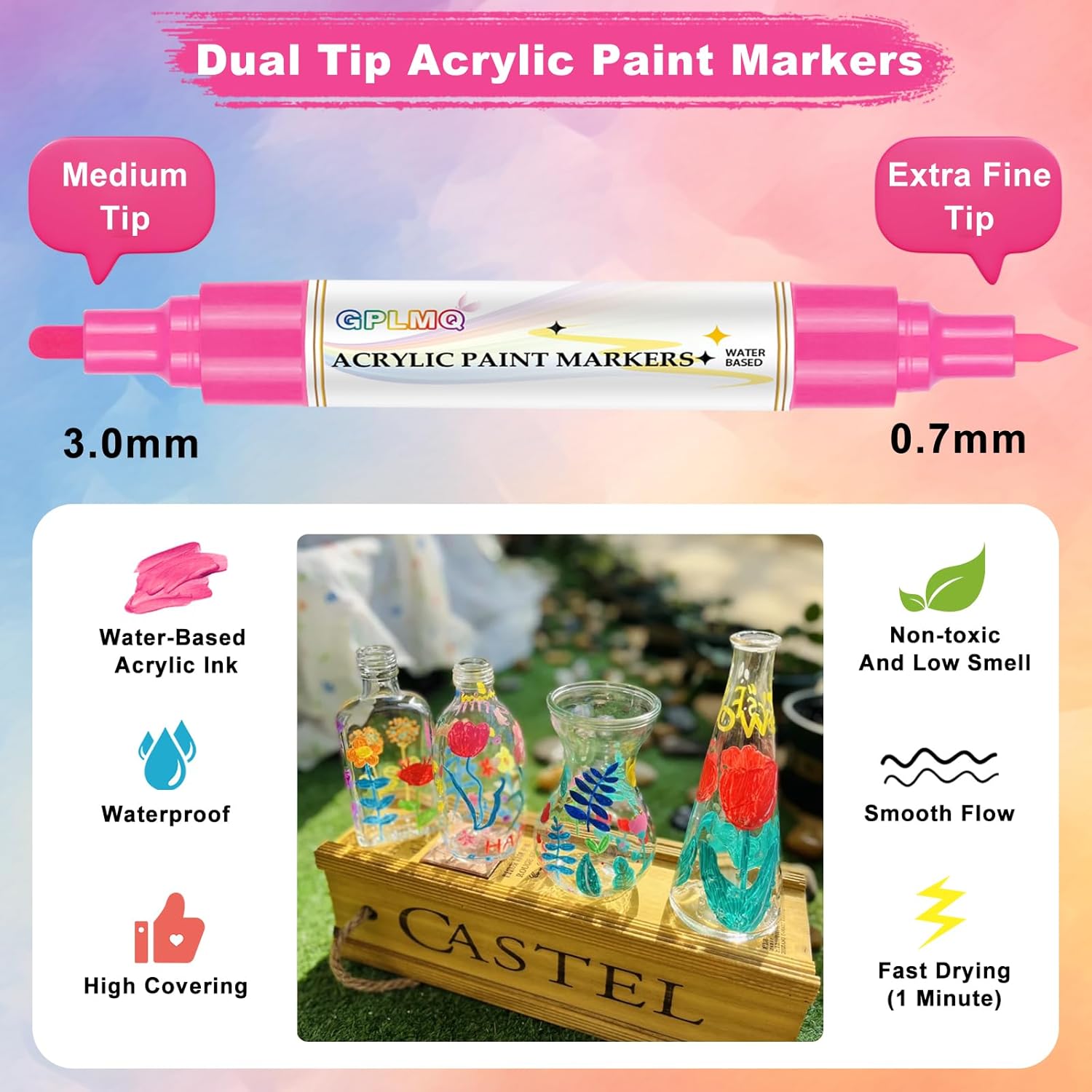 Paint Markers Paint Pens - 2 Pack Dual Tip Acrylic Permanent Marker (0.7mm & 3mm), Non-Toxic, Water-Based for Art Painting, Stone, Ceramic, Glass, Wood, Fabric, Metal, DIY Crafts (Pink)
